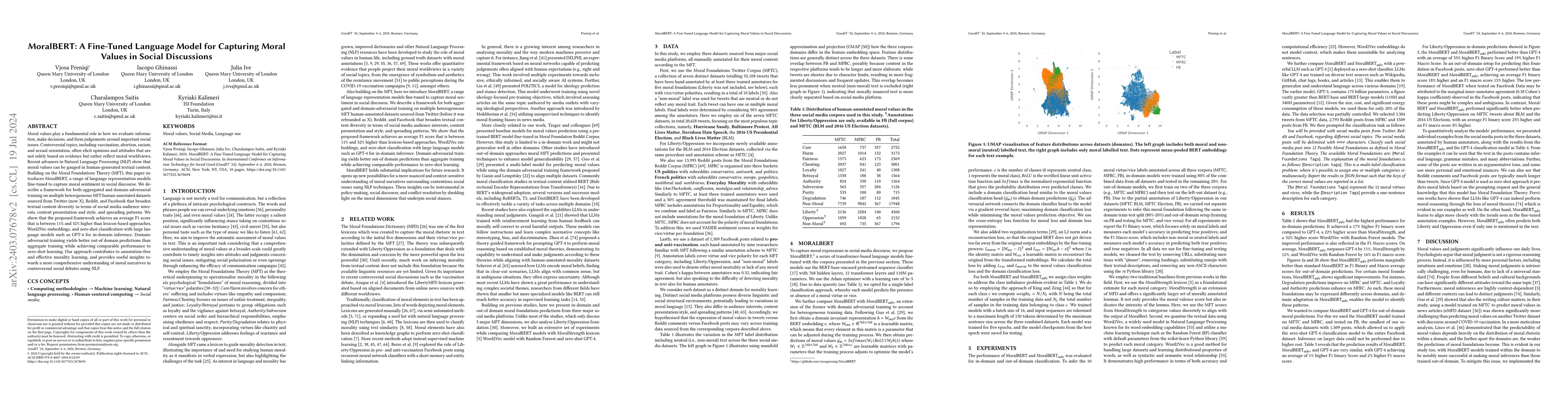 The paper introduces MoralBERT, a fine-tuned language model designed to detect moral values in social discourse, trained on diverse datasets from Twitter, Reddit, and Facebook. The study shows that in-domain prediction models significantly outperform traditional lexicon-based and Word2Vec classifiers, though domain adaptation remains a challenge for out-of-domain settings, especially for multi-label predictions.