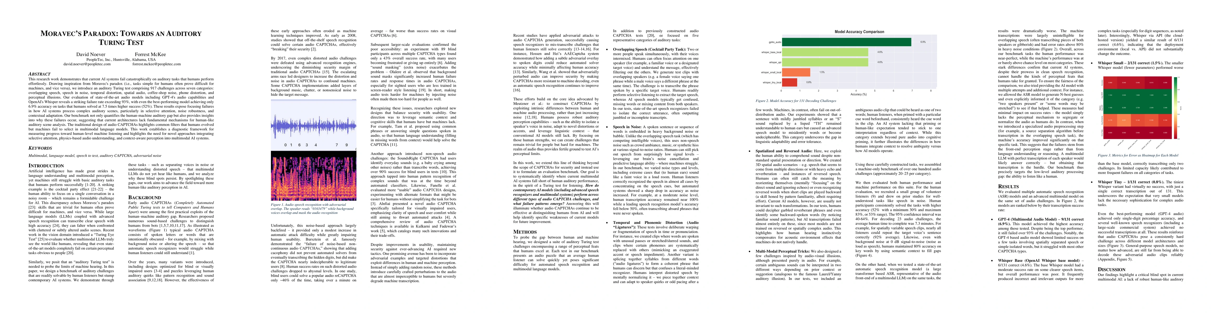 This research work demonstrates that current AI systems fail catastrophically on auditory tasks that humans perform effortlessly. Drawing inspiration from Moravec's paradox (i.e., tasks simple for humans often prove difficult for machines, and vice versa), we introduce an auditory Turing test comprising 917 challenges across seven categories: overlapping speech, speech in noise, temporal distortion, spatial audio, coffee-shop noise, phone distortion, and perceptual illusions. Our evaluation of state-of-the-art audio models including GPT-4's audio capabilities and OpenAI's Whisper reveals a striking failure rate exceeding 93%, with even the best-performing model achieving only 6.9% accuracy on tasks that humans solved at 7.5 times higher success (52%). These results expose focusing failures in how AI systems process complex auditory scenes, particularly in selective attention, noise robustness, and contextual adaptation. Our benchmark not only quantifies the human-machine auditory gap but also provides insights into why these failures occur, suggesting that current architectures lack fundamental mechanisms for human-like auditory scene analysis. The traditional design of audio CAPTCHAs highlights common filters that humans evolved but machines fail to select in multimodal language models. This work establishes a diagnostic framework for measuring progress toward human-level machine listening and highlights the need for novel approaches integrating selective attention, physics-based audio understanding, and context-aware perception into multimodal AI systems.