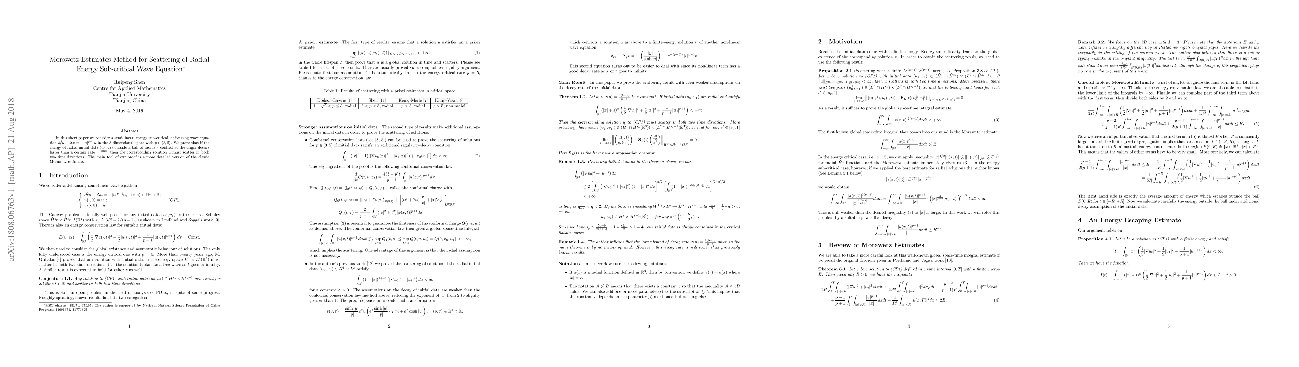 This paper proves that under specific conditions on radial initial data decay, solutions to a semi-linear wave equation scatter in both time directions. The proof utilizes a refined version of the Morawetz estimate method.