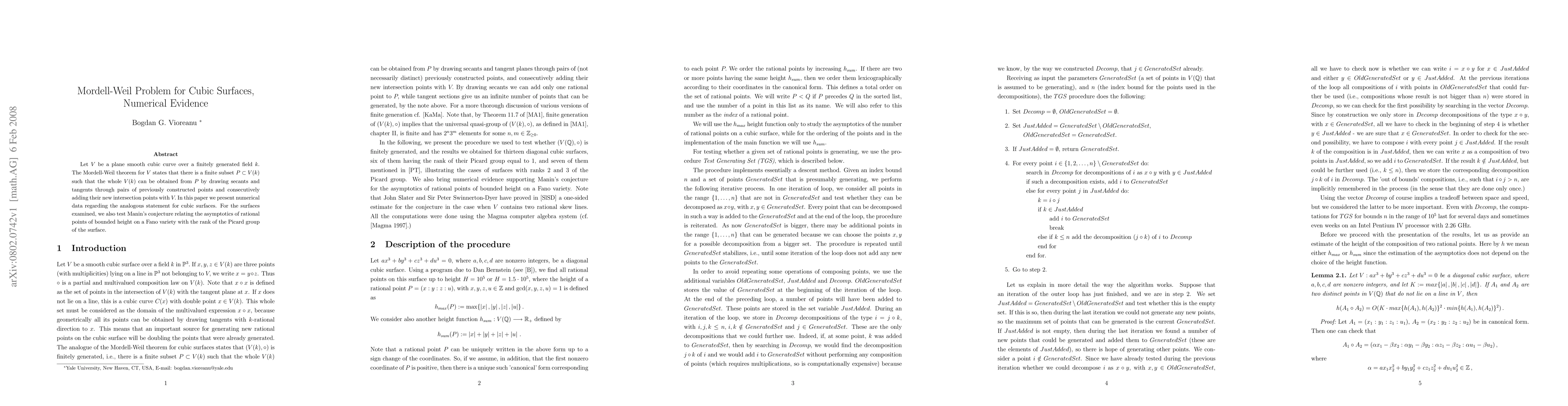 This paper presents numerical data exploring the Mordell-Weil theorem for cubic surfaces, examining the generation of rational points through secants and tangents, and tests Manin's conjecture linking the asymptotics of rational points on Fano varieties to the rank of the surface's Picard group.