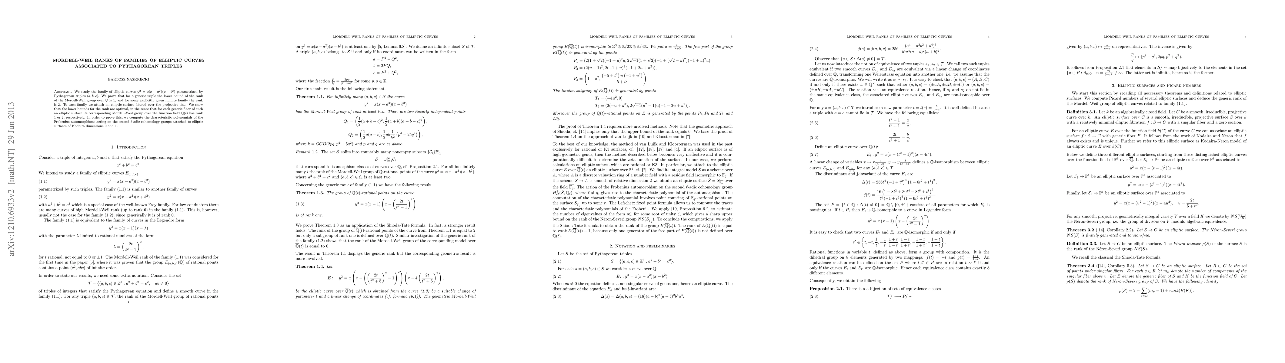 We study the family of elliptic curves $y^2=x(x-a^2)(x-b^2)$ parametrized by Pythagorean triples $(a,b,c)$. We prove that for a generic triple the lower bound of the rank of the Mordell-Weil group over $\mathbb{Q}$ is 1, and for some explicitly given infinite family the rank is 2. To each family we attach an elliptic surface fibered over the projective line. We show that the lower bounds for the rank are optimal, in the sense that for each generic fiber of such an elliptic surface its corresponding Mordell-Weil group over the function field $\mathbb{Q}(t)$ has rank 1 or 2, respectively. In order to prove this, we compute the characteristic polynomials of the Frobenius automorphisms acting on the second $\ell$-adic cohomology groups attached to elliptic surfaces of Kodaira dimensions 0 and 1.