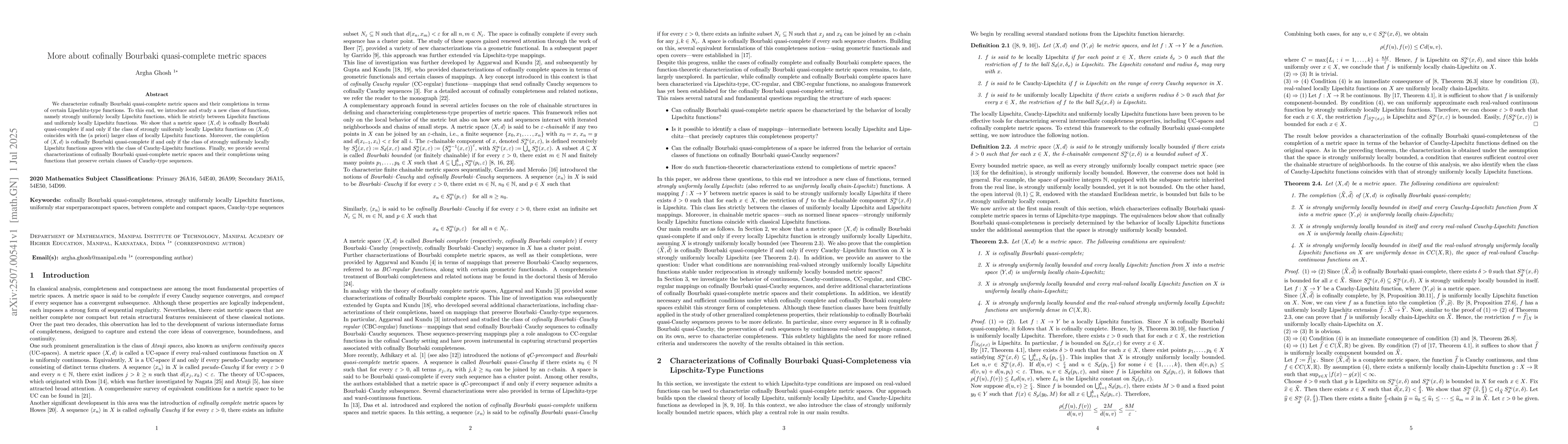 This paper introduces strongly uniformly locally Lipschitz functions to characterize cofinally Bourbaki quasi-complete metric spaces and their completions. It establishes that a metric space is cofinally Bourbaki quasi-complete if its strongly uniformly locally Lipschitz functions match locally Lipschitz functions. The completion of the space is cofinally Bourbaki quasi-complete when its strongly uniformly locally Lipschitz functions align with Cauchy-Lipschitz functions, with additional characterizations provided via Cauchy-type sequence preserving functions.
