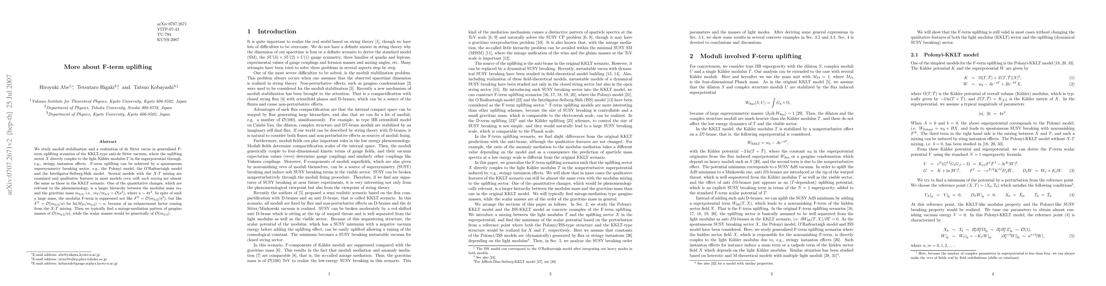 This paper explores moduli stabilization and de Sitter vacua realization in generalized F-term uplifting scenarios, focusing on the KKLT-type anti-de Sitter vacuum. It finds that despite X-T mixing, the qualitative features remain similar to the KKLT scenario, with a notable larger hierarchy between the modulus mass and gravitino mass, leading to a mirage-mediation pattern for gaugino masses.