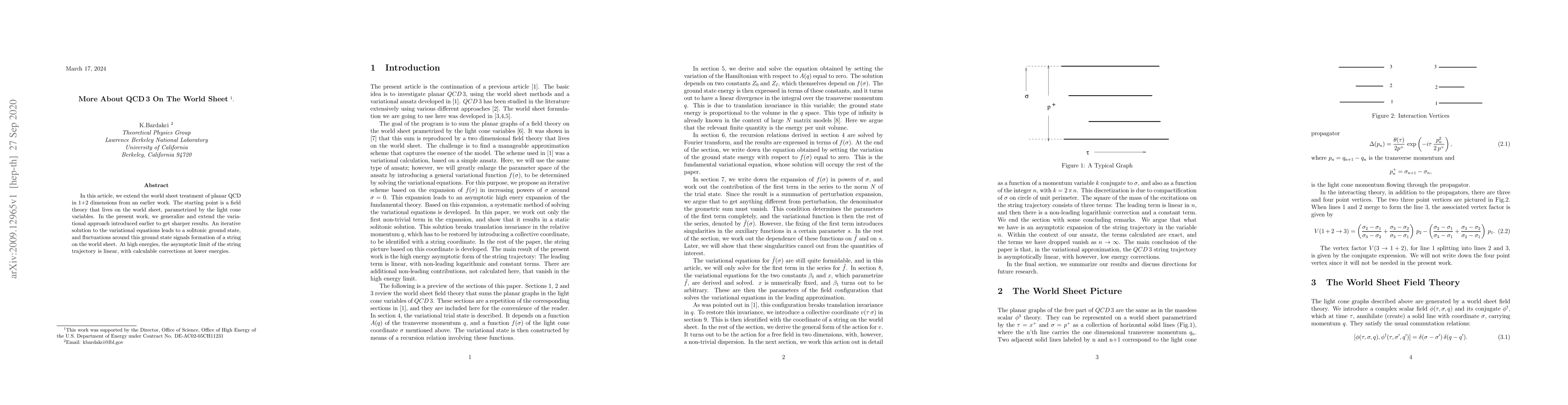This research extends the world sheet treatment of planar QCD in 1+2 dimensions, refining a variational approach to achieve more precise results. An iterative solution reveals a solitonic ground state, with fluctuations indicating the formation of a string whose high-energy trajectory is linear with calculable corrections at lower energies.