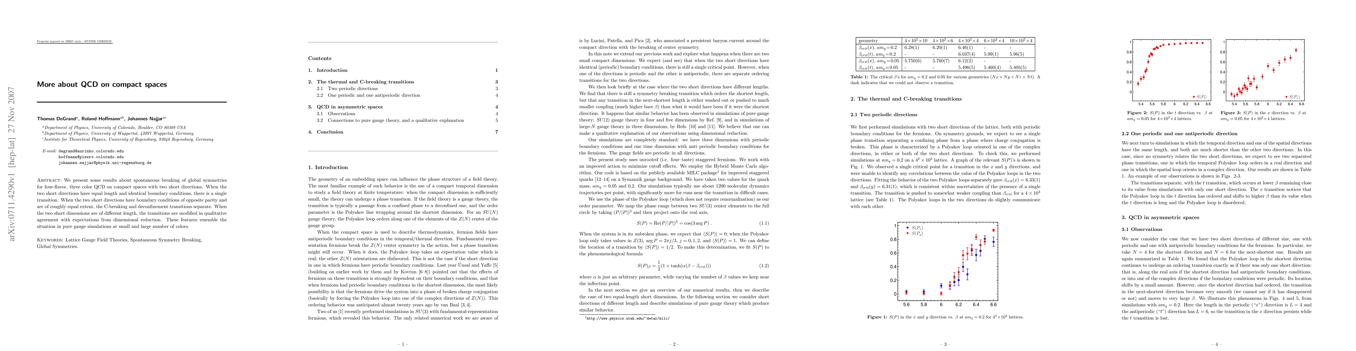 We present some results about spontaneous breaking of global symmetries for four-flavor, three color QCD on compact spaces with two short directions. When the two short directions have equal length and identical boundary conditions, there is a single transition. When the two short directions have boundary conditions of opposite parity and are of roughly equal extent, the C-breaking and deconfinement transitions separate. When the two short dimensions are of different length, the transitions are modified in qualitative agreement with expectations from dimensional reduction. These features resemble the situation in pure gauge simulations at small and large number of colors.