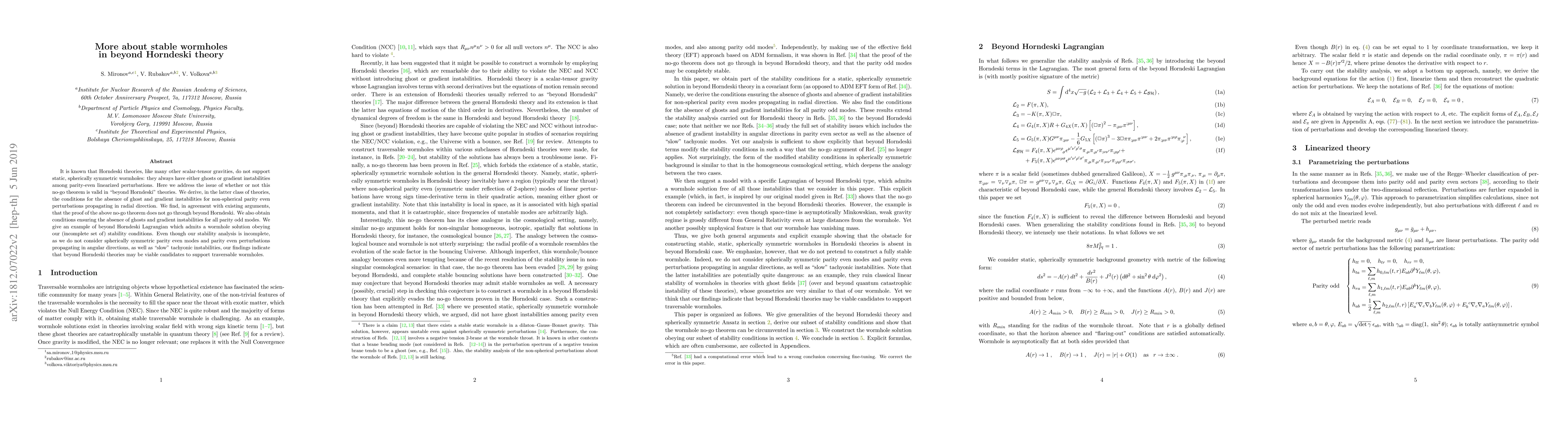 This paper explores the possibility of stable wormholes in "beyond Horndeski" theories, finding that these theories can support wormholes without the ghost or gradient instabilities present in Horndeski theories. Although the analysis is incomplete, it suggests that beyond Horndeski theories may be viable for traversable wormholes.