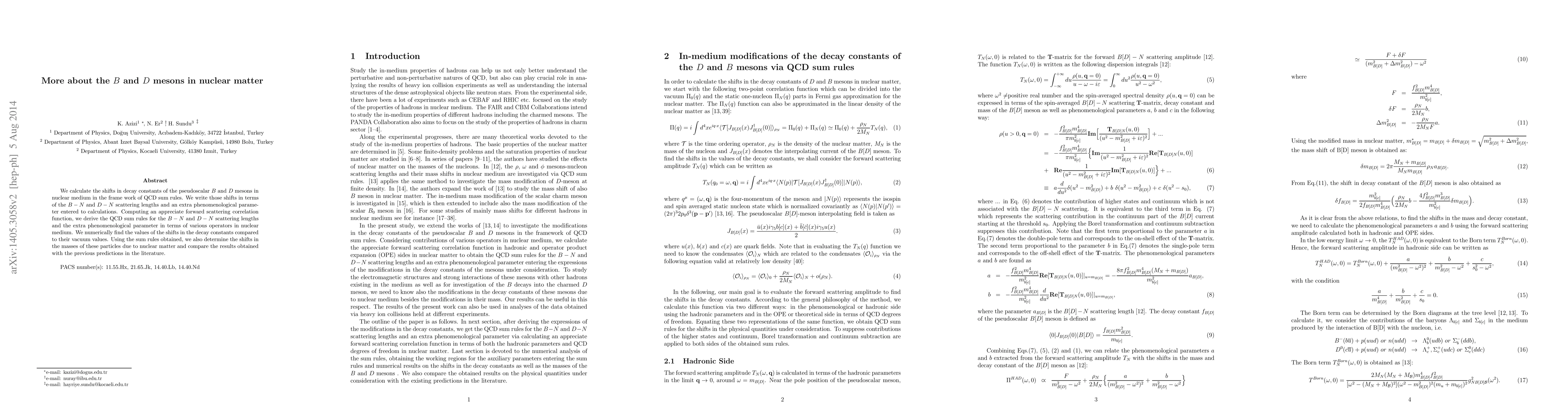 This paper calculates shifts in the decay constants of $B$ and $D$ mesons in nuclear medium using QCD sum rules, relating these shifts to $B-N$ and $D-N$ scattering lengths and an additional phenomenological parameter. The study derives QCD sum rules for these scattering lengths and determines the mass shifts of the mesons in nuclear matter, comparing the results to previous predictions.