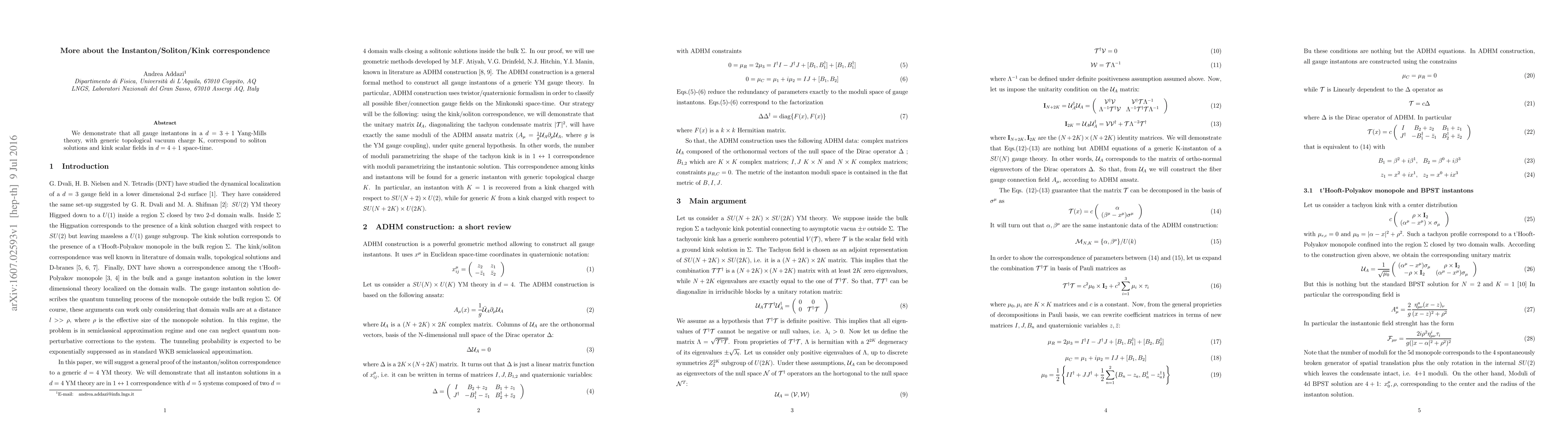 We demonstrate that all gauge instantons in a $d=3+1$ Yang-Mills theory, with generic topological vacuum charge K, correspond to soliton solutions and kink scalar fields in $d=4+1$ space-time.