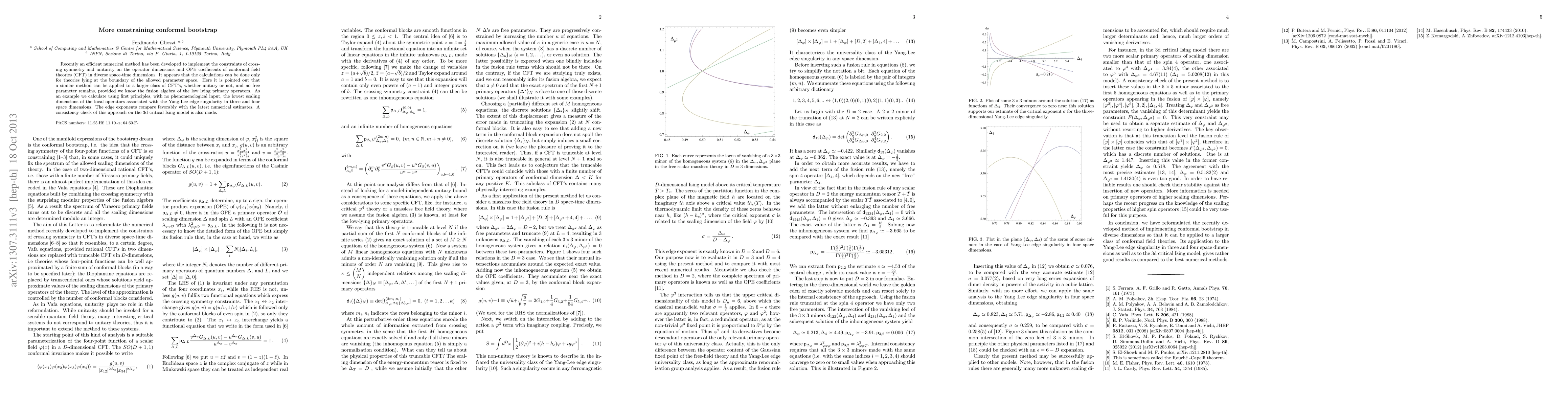 Recently an efficient numerical method has been developed to implement the constraints of crossing symmetry and unitarity on the operator dimensions and OPE coefficients of conformal field theories (CFT) in diverse space-time dimensions. It appears that the calculations can be done only for theories lying at the boundary of the allowed parameter space. Here it is pointed out that a similar method can be applied to a larger class of CFT's, whether unitary or not, and no free parameter remains, provided we know the fusion algebra of the low lying primary operators. As an example we calculate using first principles, with no phenomenological input, the lowest scaling dimensions of the local operators associated with the Yang-Lee edge singularity in three and four space dimensions. The edge exponents compare favorably with the latest numerical estimates. A consistency check of this approach on the 3d critical Ising model is also made.