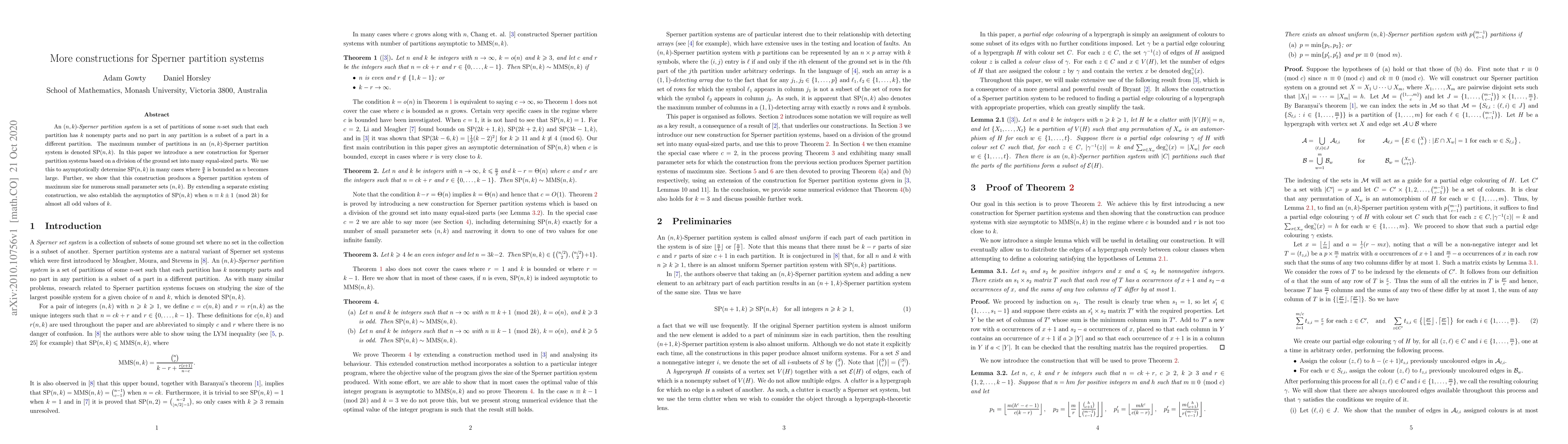 This paper introduces a new construction method for $(n,k)$-Sperner partition systems, using a division of the ground set into equal-sized parts, to determine the asymptotic behavior of $\mathrm{SP}(n,k)$ when $n/k$ is bounded. It also extends existing constructions to cover cases where $n \equiv k \pm 1 \pmod{2k}$ for almost all odd values of $k$.