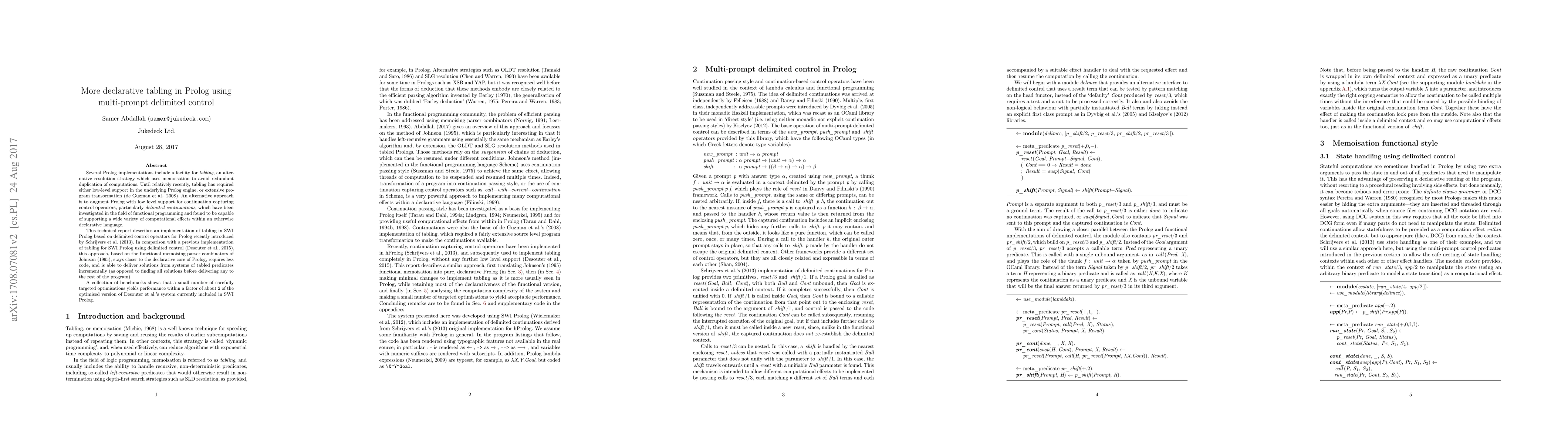 This paper presents an improved implementation of tabling in SWI Prolog using multi-prompt delimited control operators, which adheres more closely to Prolog's declarative nature and requires less code than previous methods. Performance benchmarks indicate it operates within a factor of two of the optimized prior implementation.