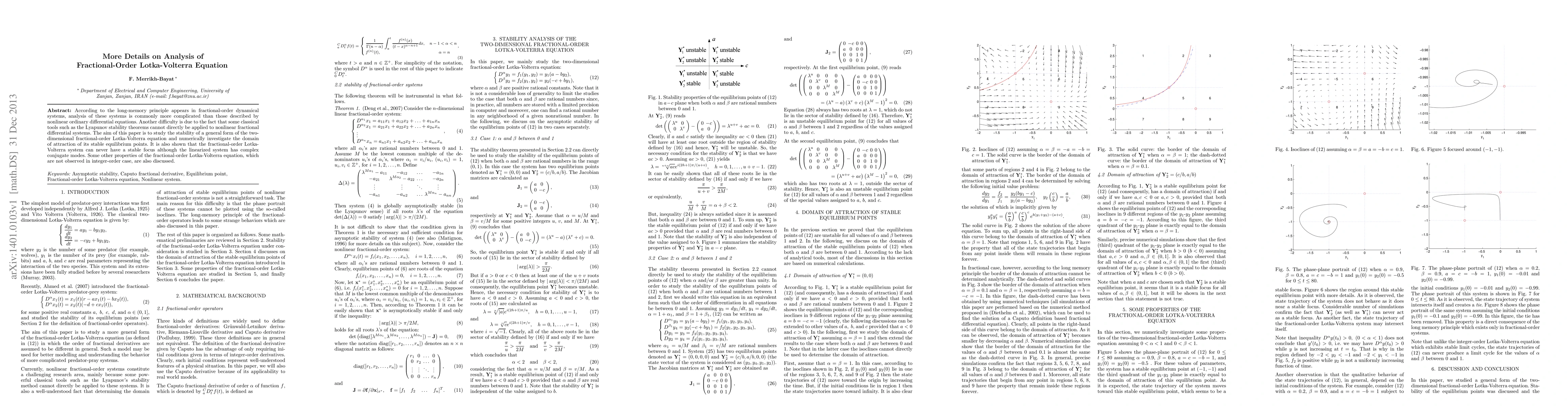 This paper investigates the stability and properties of a fractional-order Lotka-Volterra equation, revealing that it lacks stable foci despite complex conjugate modes in the linearized system. It also explores the domain of attraction for stable equilibrium points and discusses unique characteristics of fractional-order systems.