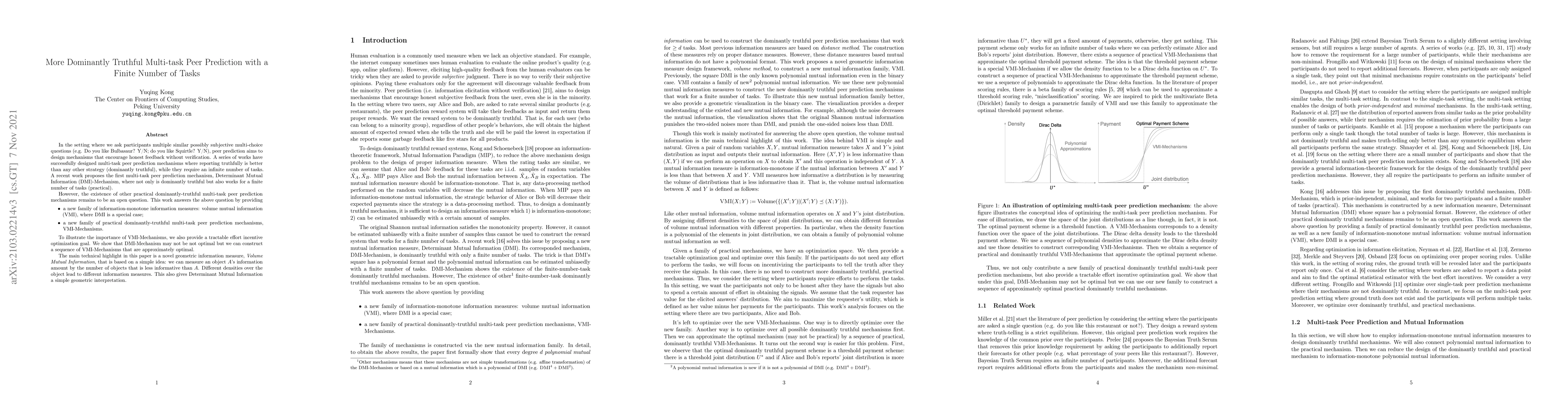 In the setting where we ask participants multiple similar possibly subjective multi-choice questions (e.g. Do you like Bulbasaur? Y/N; do you like Squirtle? Y/N), peer prediction aims to design mechanisms that encourage honest feedback without verification. A series of works have successfully designed multi-task peer prediction mechanisms where reporting truthfully is better than any other strategy (dominantly truthful), while they require an infinite number of tasks. A recent work proposes the first multi-task peer prediction mechanism, Determinant Mutual Information (DMI)-Mechanism, where not only is dominantly truthful but also works for a finite number of tasks (practical). However, the existence of other practical dominantly-truthful multi-task peer prediction mechanisms remains to be an open question. This work answers the above question by providing 1. a new family of information-monotone information measures: volume mutual information (VMI), where DMI is a special case; 2. a new family of practical dominantly-truthful multi-task peer prediction mechanisms, VMI-Mechanisms. To illustrate the importance of VMI-Mechanisms, we also provide a tractable effort incentive optimization goal. We show that DMI-Mechanism may not be not optimal but we can construct a sequence of VMI-Mechanisms that are approximately optimal. The main technical highlight in this paper is a novel geometric information measure, Volume Mutual Information, that is based on a simple idea: we can measure an object A's information amount by the number of objects that is less informative than A. Different densities over the object lead to different information measures. This also gives Determinant Mutual Information a simple geometric interpretation.