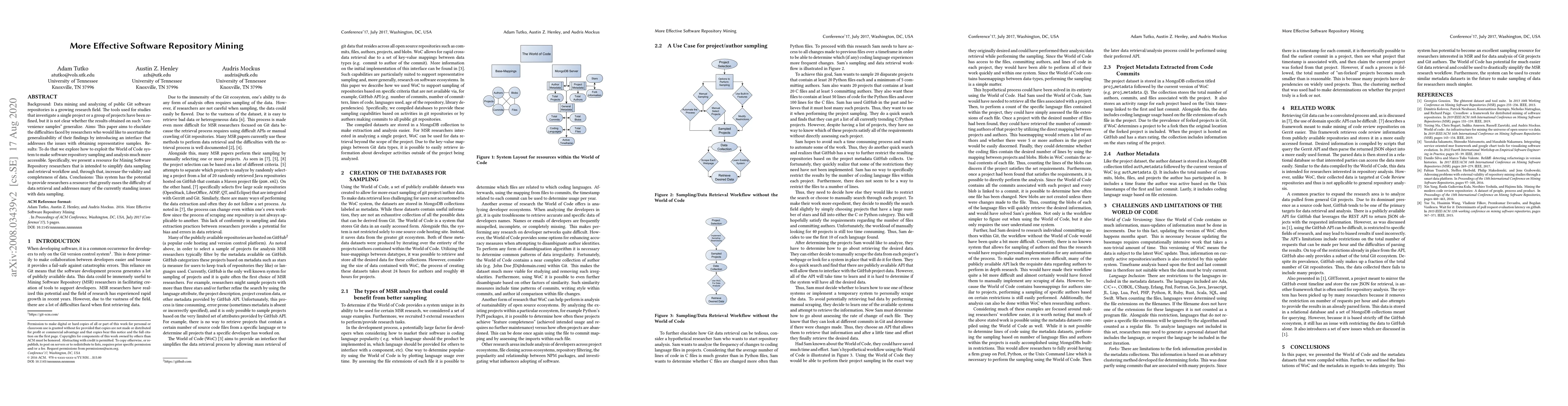 Background: Data mining and analyzing of public Git software repositories is a growing research field. The tools used for studies that investigate a single project or a group of projects have been refined, but it is not clear whether the results obtained on such ``convenience samples'' generalize. Aims: This paper aims to elucidate the difficulties faced by researchers who would like to ascertain the generalizability of their findings by introducing an interface that addresses the issues with obtaining representative samples. Results: To do that we explore how to exploit the World of Code system to make software repository sampling and analysis much more accessible. Specifically, we present a resource for Mining Software Repository researchers that is intended to simplify data sampling and retrieval workflow and, through that, increase the validity and completeness of data. Conclusions: This system has the potential to provide researchers a resource that greatly eases the difficulty of data retrieval and addresses many of the currently standing issues with data sampling.