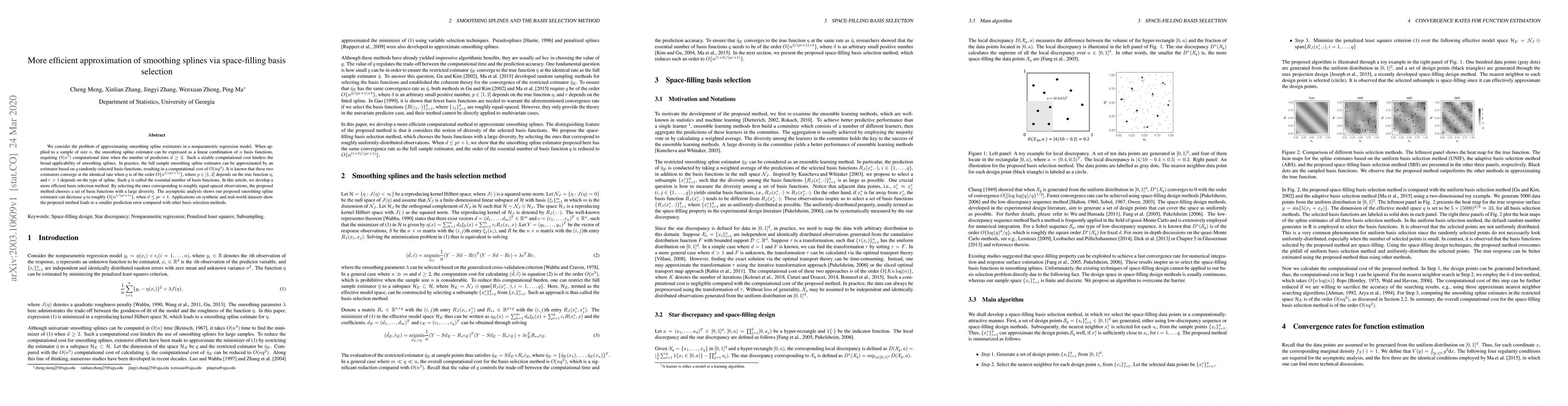 We consider the problem of approximating smoothing spline estimators in a nonparametric regression model. When applied to a sample of size $n$, the smoothing spline estimator can be expressed as a linear combination of $n$ basis functions, requiring $O(n^3)$ computational time when the number of predictors $d\geq 2$. Such a sizable computational cost hinders the broad applicability of smoothing splines. In practice, the full sample smoothing spline estimator can be approximated by an estimator based on $q$ randomly-selected basis functions, resulting in a computational cost of $O(nq^2)$. It is known that these two estimators converge at the identical rate when $q$ is of the order $O\{n^{2/(pr+1)}\}$, where $p\in [1,2]$ depends on the true function $\eta$, and $r > 1$ depends on the type of spline. Such $q$ is called the essential number of basis functions. In this article, we develop a more efficient basis selection method. By selecting the ones corresponding to roughly equal-spaced observations, the proposed method chooses a set of basis functions with a large diversity. The asymptotic analysis shows our proposed smoothing spline estimator can decrease $q$ to roughly $O\{n^{1/(pr+1)}\}$, when $d\leq pr+1$. Applications on synthetic and real-world datasets show the proposed method leads to a smaller prediction error compared with other basis selection methods.