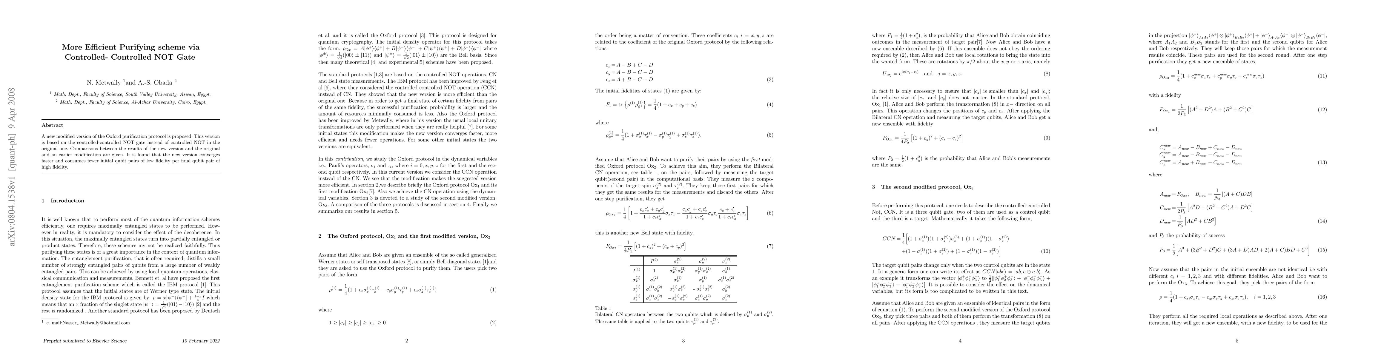 A new modified version of the Oxford purification protocol is proposed. This version is based on the controlled-controlled NOT gate instead of controlled NOT in the original one. Comparisons between the results of the new version and the original and an earlier modification are given. It is found that the new version converges faster and consumes fewer initial qubit pairs of low fidelity per final qubit pair of high fidelity.