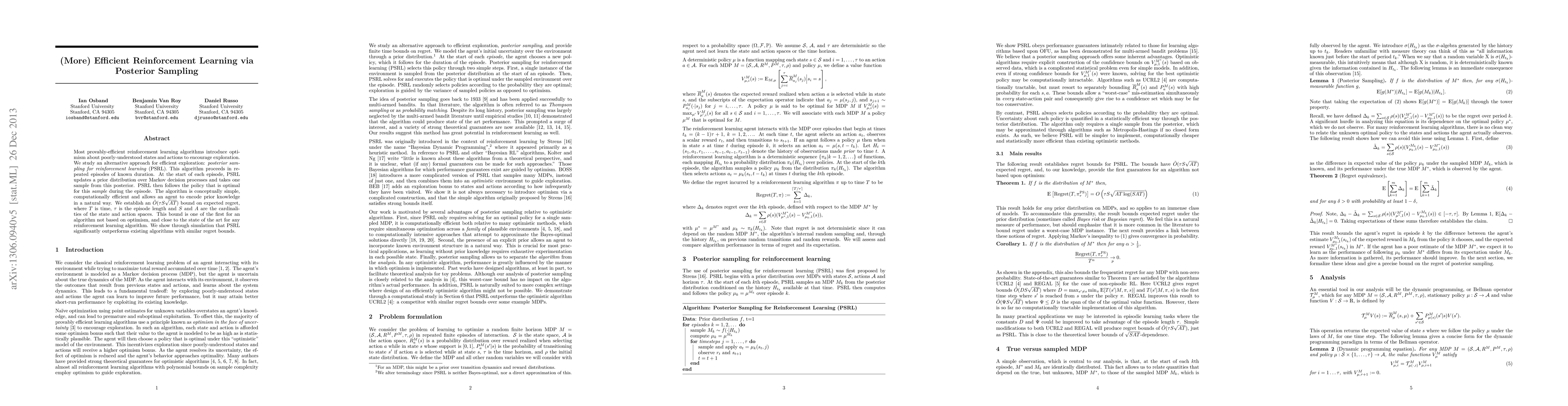 This paper proposes posterior sampling for reinforcement learning (PSRL), an exploration method that updates a prior distribution over Markov decision processes and selects actions based on samples from the posterior. PSRL achieves competitive regret bounds and outperforms existing algorithms in simulations, demonstrating its efficiency without relying on optimism.