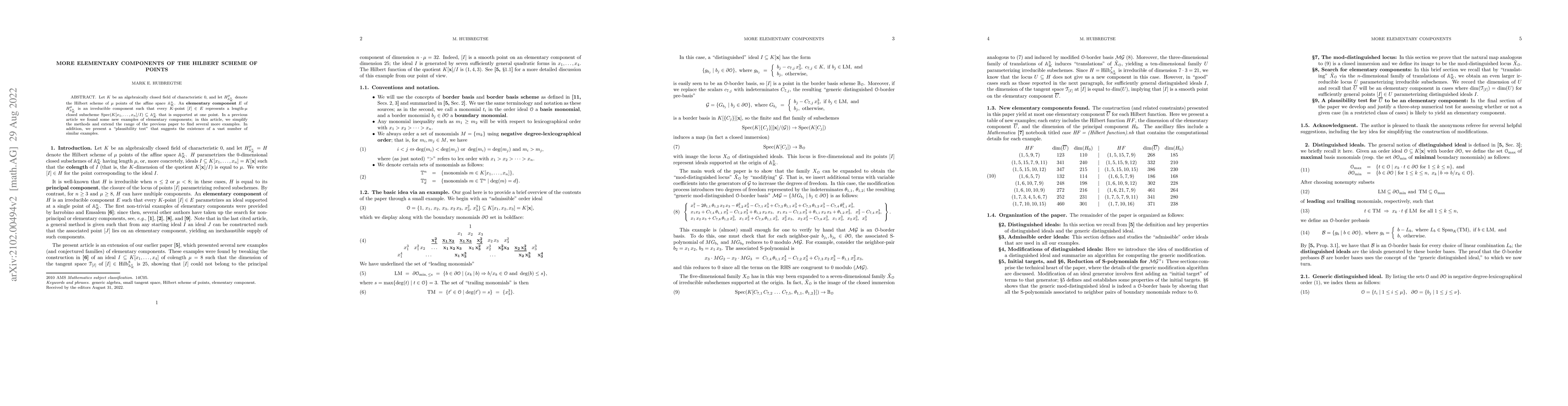 This paper explores the Hilbert scheme of $\mu$ points in affine space over an algebraically closed field, focusing on elementary components—irreducible parts representing length-$\mu$ subschemes supported at a single point. The authors simplify previous methods and extend their findings to discover additional examples, along with a plausibility test indicating many more such examples likely exist.