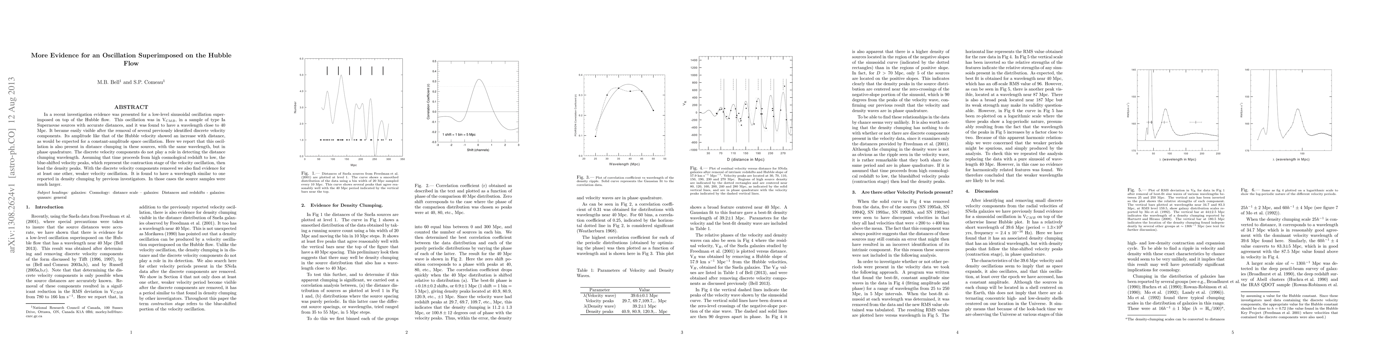 In a recent investigation evidence was presented for a low-level sinusoidal oscillation superimposed on top of the Hubble flow. This oscillation was in V$_{CMB}$, in a sample of type Ia Supernovae sources with accurate distances, and it was found to have a wavelength close to 40 Mpc. It became easily visible after the removal of several previously identified discrete velocity components. Its amplitude like that of the Hubble velocity showed an increase with distance, as would be expected for a constant-amplitude space oscillation. Here we report that this oscillation is also present in distance clumping in these sources, with the same wavelength, but in phase quadrature. The discrete velocity components do not play a role in detecting the distance clumping wavelength. Assuming that time proceeds from high cosmological redshift to low, the blue-shifted velocity peaks, which represent the contraction stage of the velocity oscillation, then lead the density peaks. With the discrete velocity components removed we also find evidence for at least one other, weaker velocity oscillation. It is found to have a wavelength similar to one reported in density clumping by previous investigators. In those cases the source samples were much larger.