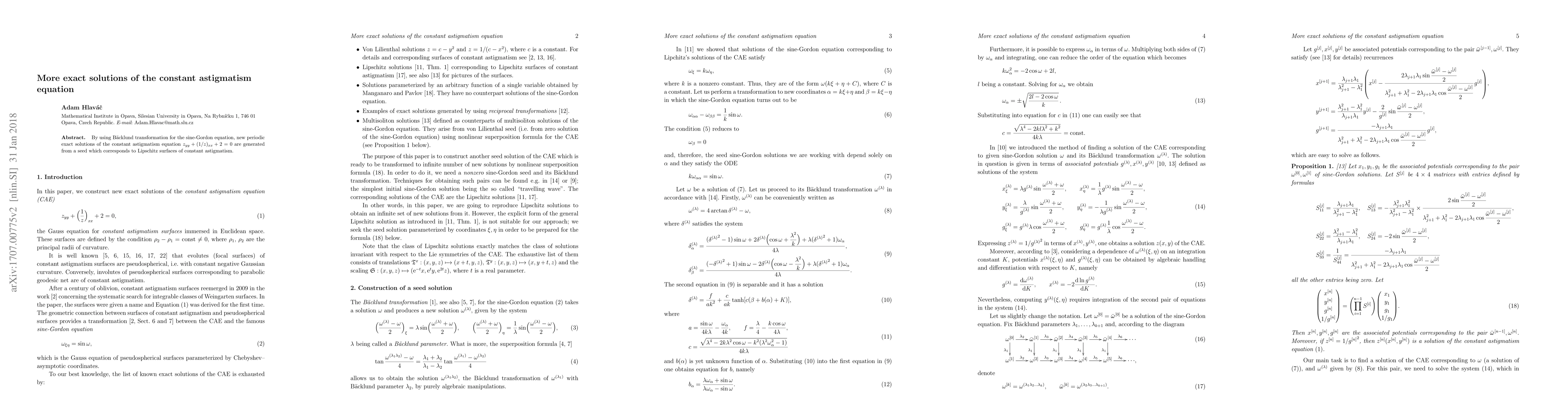 Researchers used B"acklund transformation to generate new exact solutions for the constant astigmatism equation, a mathematical model describing optical aberrations in lenses.