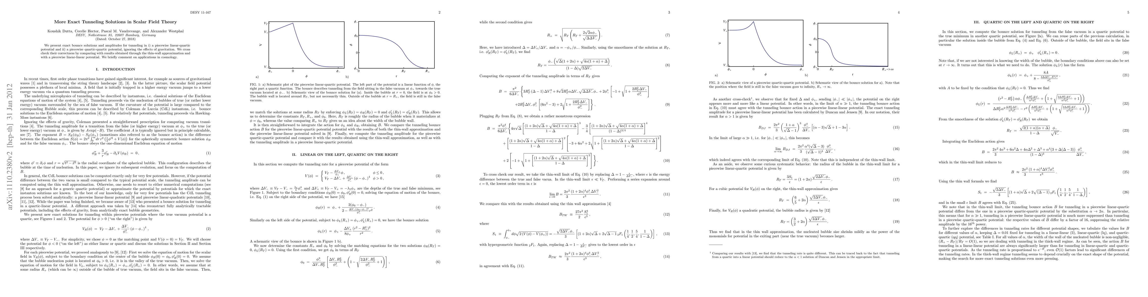 This paper presents exact solutions for tunneling in scalar field theory through piecewise linear-quartic and quartic-quartic potentials, verifying their accuracy against thin-wall approximations and linear-linear potentials, with brief remarks on cosmological applications.