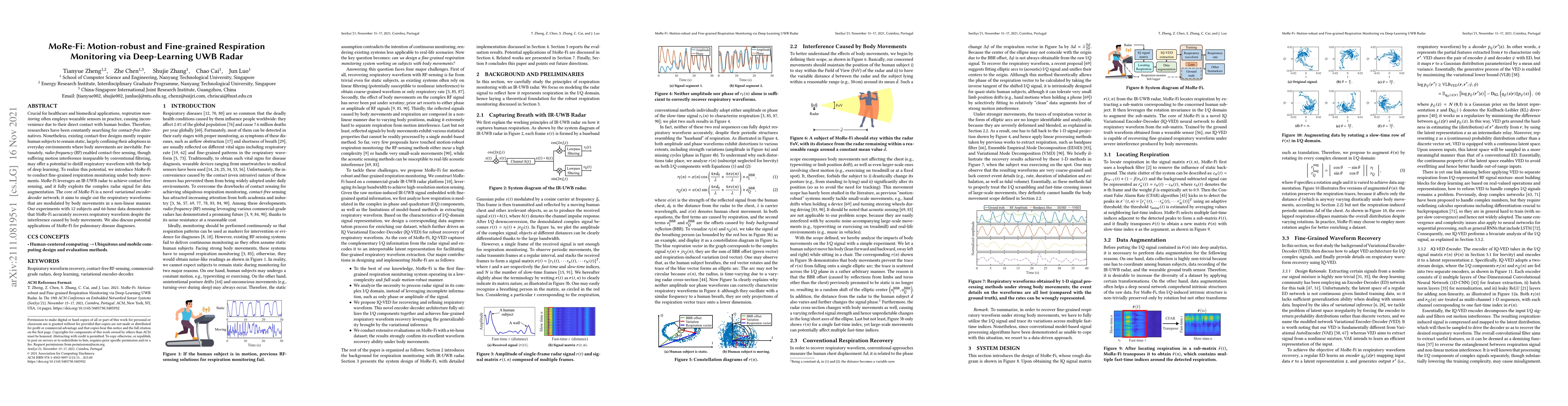 MoRe-Fi employs an IR-UWB radar and a novel deep learning-based variational encoder-decoder network to achieve fine-grained, motion-robust respiration monitoring without contact. Experiments show accurate recovery of respiratory waveforms despite body movements, highlighting potential for pulmonary disease diagnosis.