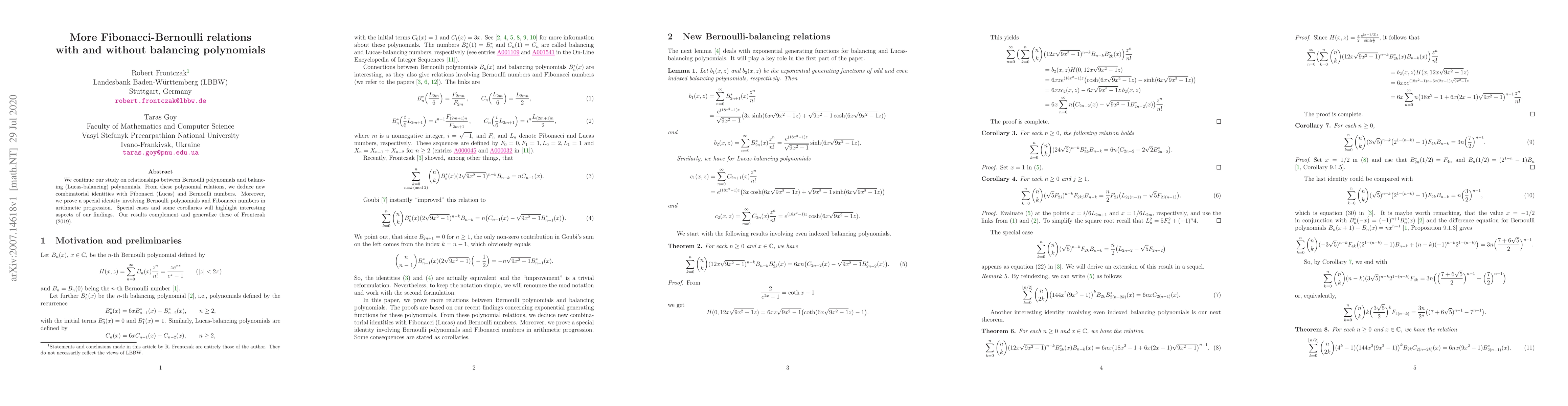 We continue our study on relationships between Bernoulli polynomials and balancing (Lucas-balancing) polynomials. From these polynomial relations, we deduce new combinatorial identities with Fibonacci (Lucas) and Bernoulli numbers. Moreover, we prove a special identity involving Bernoulli polynomials and Fibonacci numbers in arithmetic progression. Special cases and some corollaries will highlight interesting aspects of our findings. Our results complement and generalize these of Frontczak (2019).