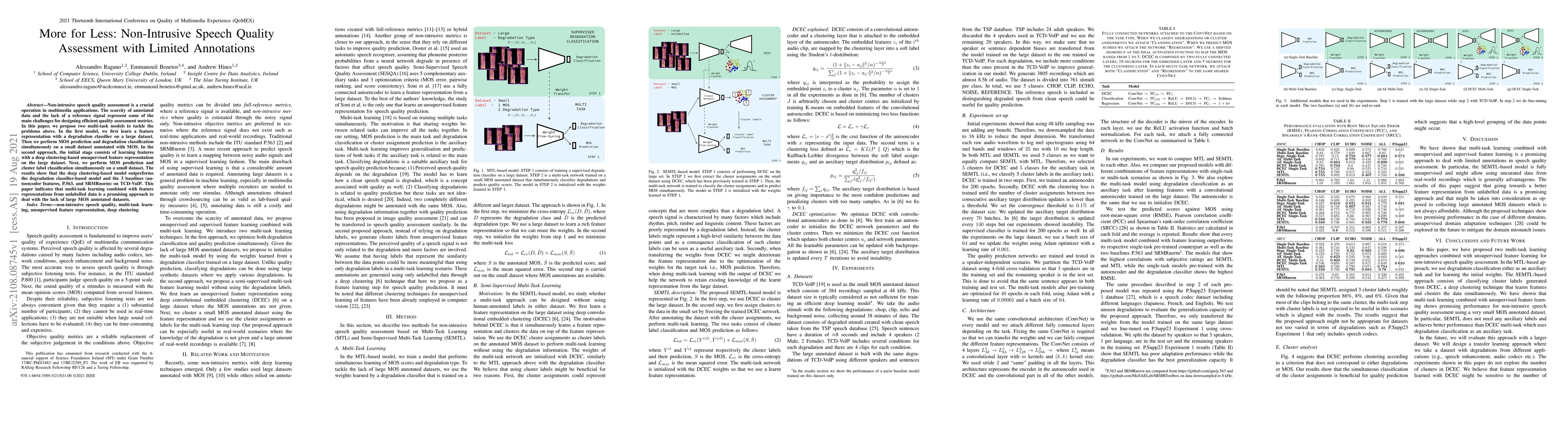 This paper proposes two multi-task learning models for non-intrusive speech quality assessment using limited annotated data. The deep clustering-based model outperforms the degradation classifier-based model and baselines, indicating that leveraging unlabelled data for feature representation is effective.