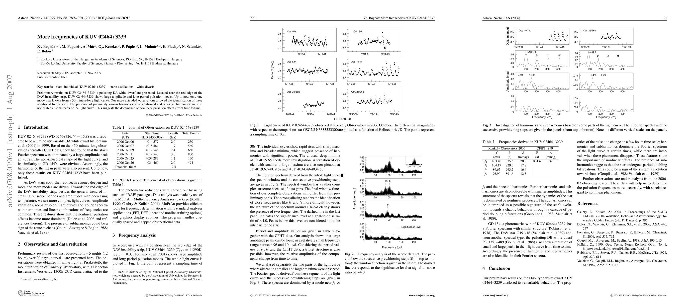 The study of KUV 02464+3239, a pulsating DA white dwarf, revealed three new pulsation frequencies, confirming harmonics and noting weak subharmonics, suggesting nonlinear pulsation effects.