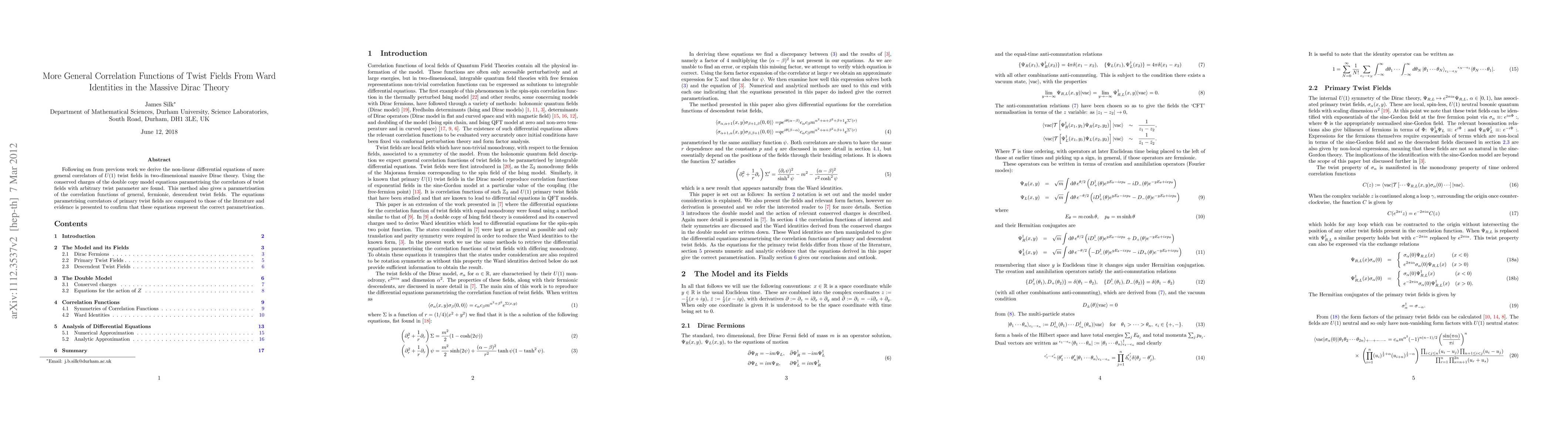 Following on from previous work we derive the non-linear differential equations of more general correlators of U(1) twist fields in two-dimensional massive Dirac theory. Using the conserved charges of the double copy model equations parametrising the correlators of twist fields with arbitrary twist parameter are found. This method also gives a parametrisation of the correlation functions of general, fermionic, descendent twist fields. The equations parametrising correlators of primary twist fields are compared to those of the literature and evidence is presented to confirm that these equations represent the correct parametrisation.