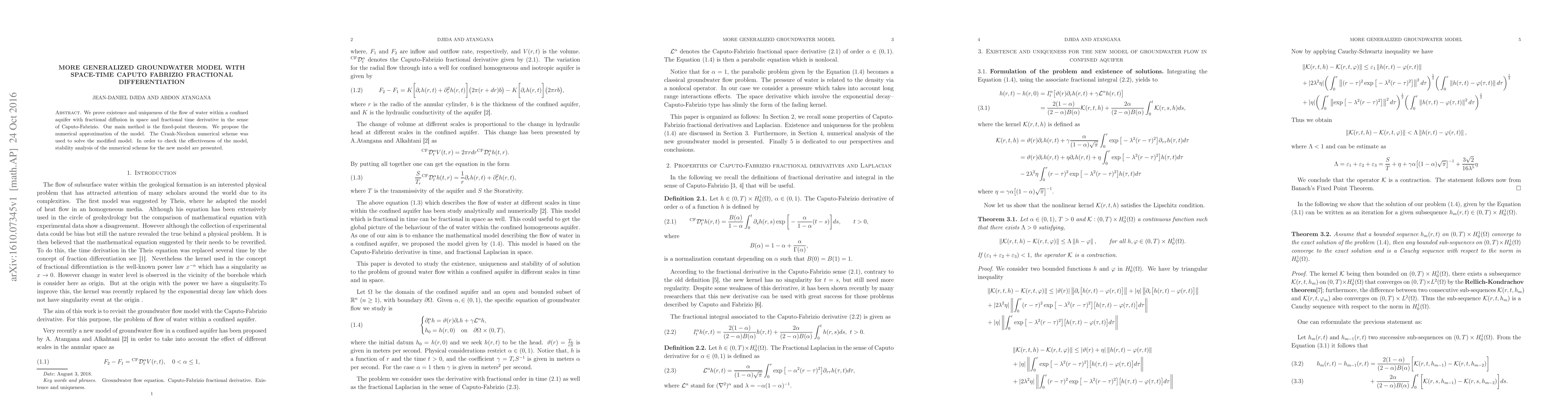 We prove existence and uniqueness of the flow of water within a confined aquifer with fractional diffusion in space and fractional time derivative in the sense of Caputo-Fabrizio. Our main method is the fixed-point theorem. We propose the numerical approximation of the model. The Crank-Nicolson numerical scheme was used to solve the modified model. In order to check the effectiveness of the model, stability analysis of the numerical scheme for the new model are presented.