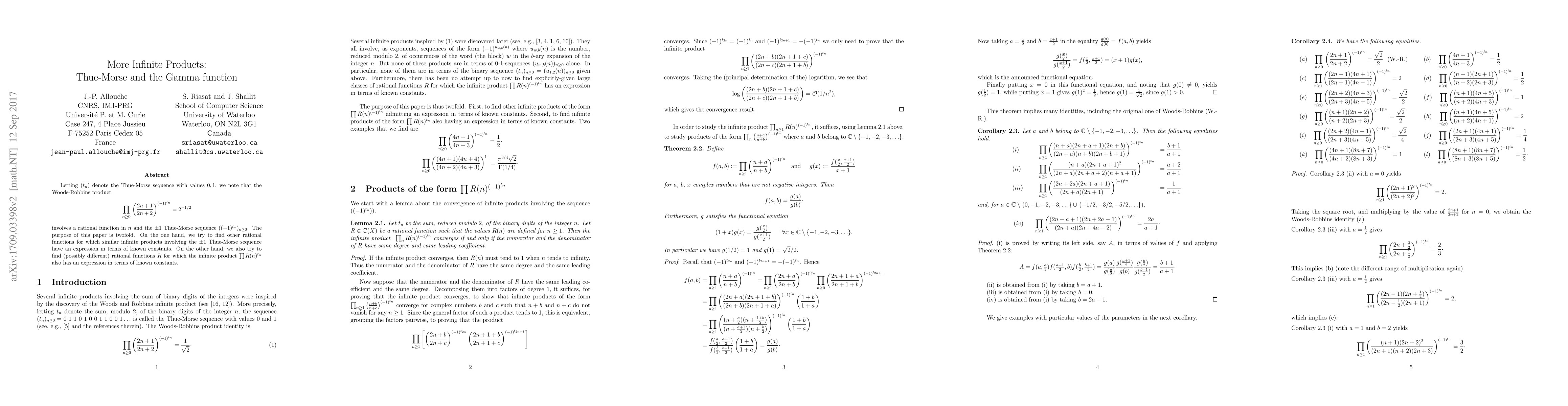 This paper investigates infinite products involving the Thue-Morse sequence and rational functions, aiming to find similar expressions to the Woods-Robbins product that yield known constants, and to explore additional rational functions that produce such results.