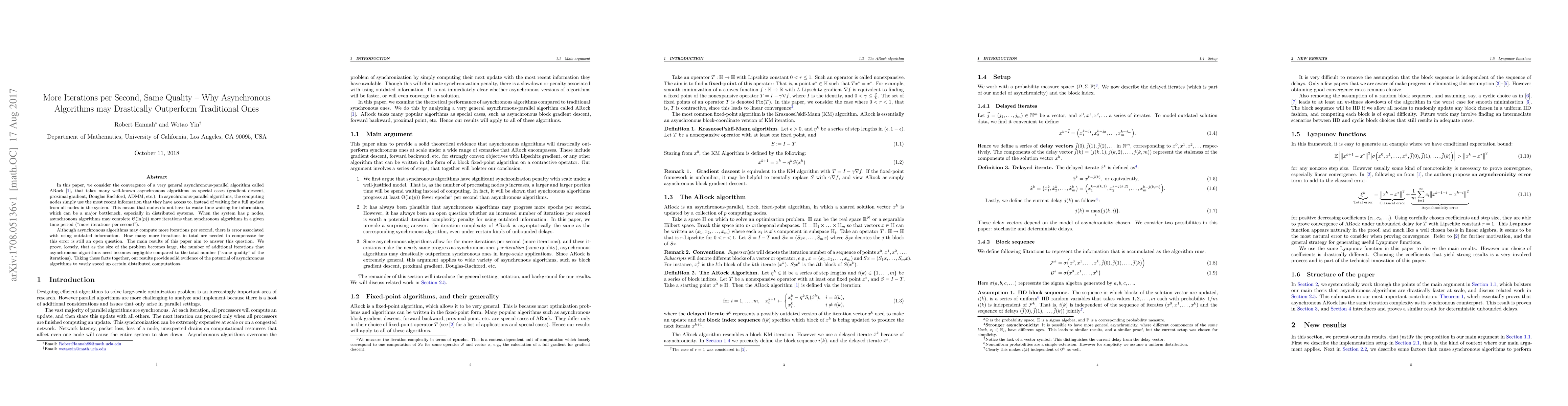 This paper investigates the performance of asynchronous-parallel algorithms like ARock, showing they can complete significantly more iterations per second than synchronous ones in distributed systems. Despite potential errors from outdated information, the study proves that as problem size increases, the additional iterations needed to compensate for these errors become negligible, suggesting asynchronous algorithms can drastically outperform traditional ones while maintaining quality.