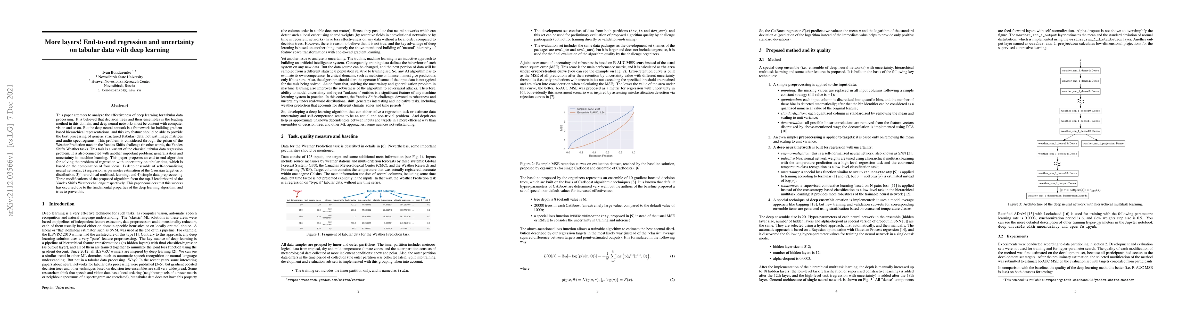 This paper explores deep learning's effectiveness for tabular data regression, proposing an end-to-end algorithm combining deep ensembles, Gaussian target error distribution, hierarchical multitask learning, and simple preprocessing. The approach achieves top-3 results in the Yandex Shifts Weather challenge, demonstrating deep learning's potential beyond traditional domains.