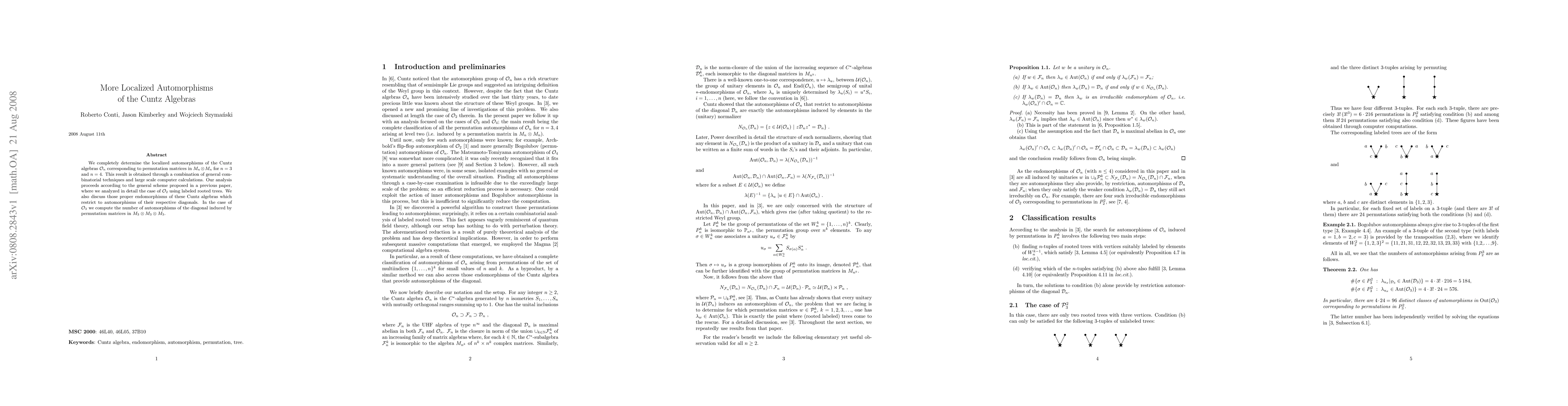 We completely determine the localized automorphisms of the Cuntz algebras $O_n$ corresponding to permutation matrices in $M_n \otimes M_n$ for $n=3$ and $n=4$. This result is obtained through a combination of general combinatorial techniques and large scale computer calculations. Our analysis proceeds according to the general scheme proposed in a previous paper, where we analyzed in detail the case of $O_2$ using labeled rooted trees. We also discuss those proper endomorphisms of these Cuntz algebras which restrict to automorphisms of their respective diagonals. In the case of $O_3$ we compute the number of automorphisms of the diagonal induced by permutation matrices in $M_3 \otimes M_3 \otimes M_3$.