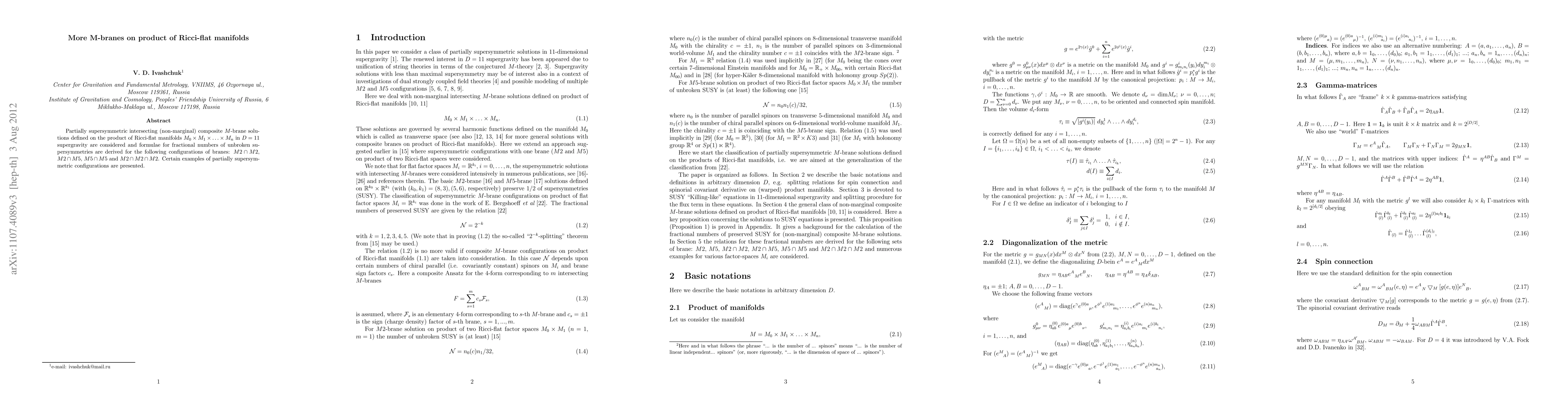 Partially supersymmetric intersecting (non-marginal) composite M-brane solutions defined on the product of Ricci-flat manifolds M_0 x M_1 x ... x M_n in D= 11 supergravity are considered and formulae for fractional numbers of unbroken supersymmetries are derived for the following configurations of branes: M2 - M2, M2 - M5, M5 - M5 and M2 - M2 - M2. Certain examples of partially supersymmetric configurations are presented.