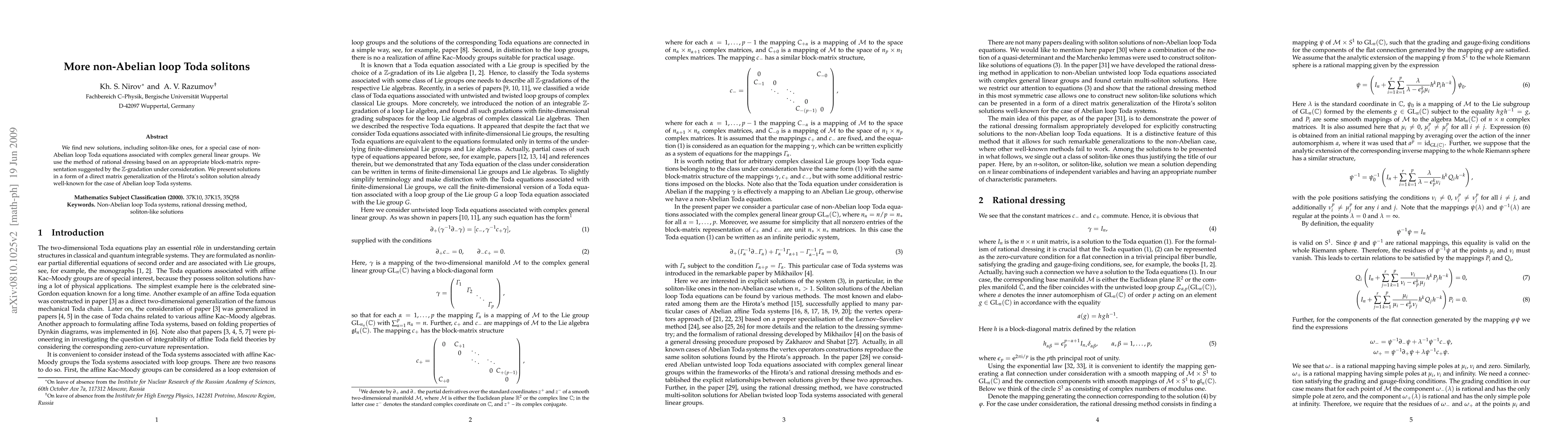 This paper discovers new soliton-like solutions for non-Abelian loop Toda equations using the rational dressing method and a block-matrix representation. The solutions are presented as a matrix generalization of Hirota's soliton solution, extending the approach from Abelian to non-Abelian systems.