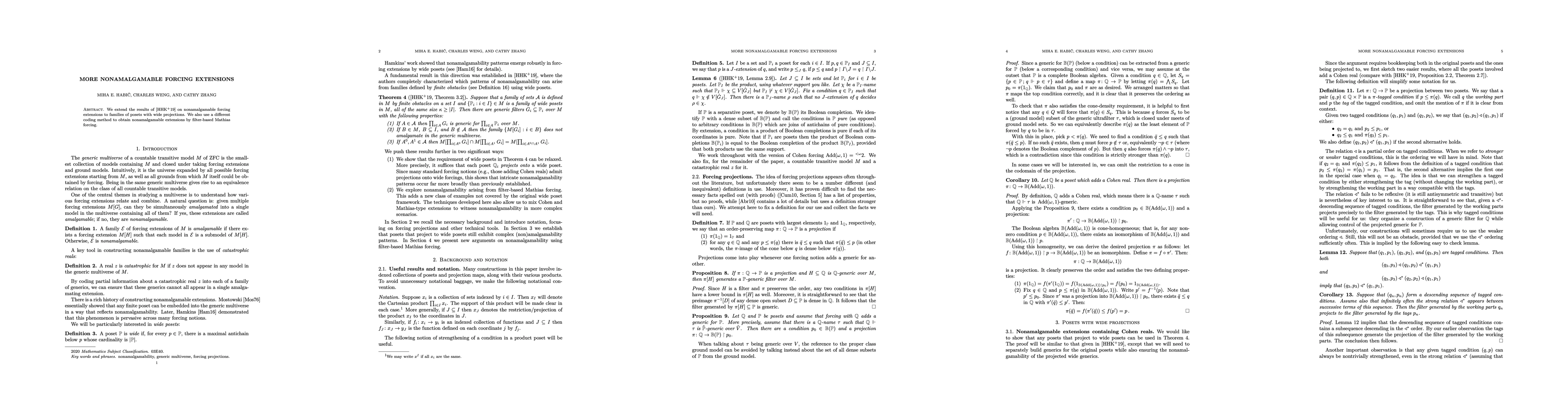 The research extends previous work on nonamalgamable forcing extensions, focusing on families of posets with wide projections and employing a distinct filter-based Mathias forcing coding method.