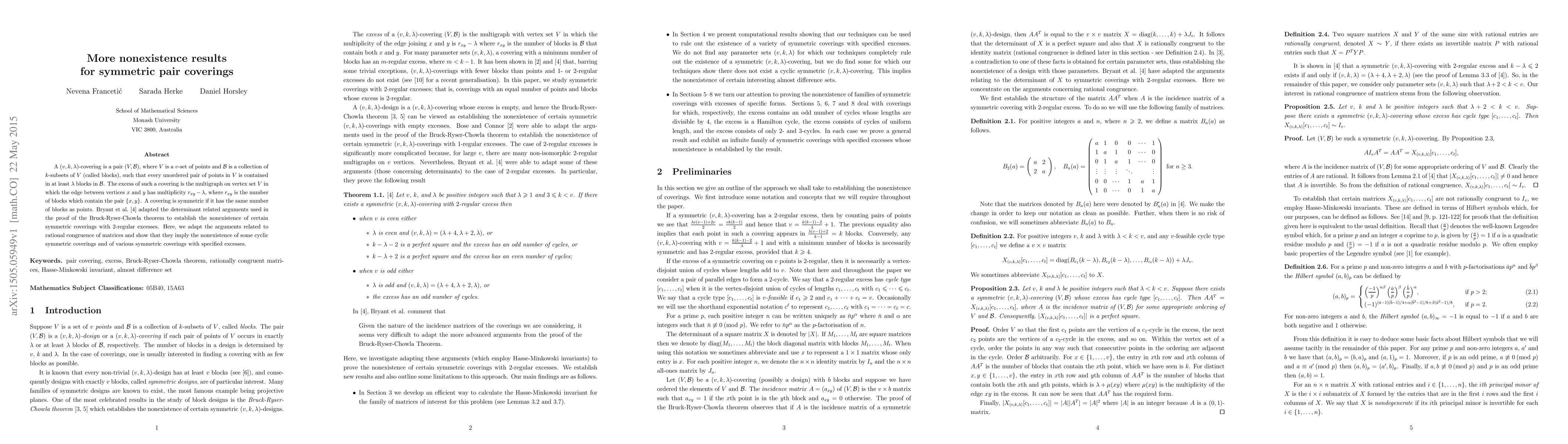 Researchers prove the nonexistence of certain symmetric pair coverings with specified excesses using rational congruence arguments, building on previous work in combinatorics and graph theory.