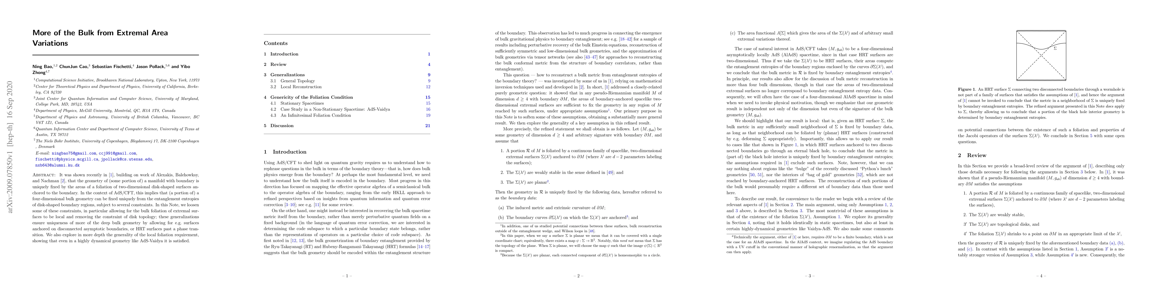 It was shown recently, building on work of Alexakis, Balehowksy, and Nachman that the geometry of (some portion of) a manifold with boundary is uniquely fixed by the areas of a foliation of two-dimensional disk-shaped surfaces anchored to the boundary. In the context of AdS/CFT, this implies that (a portion of) a four-dimensional bulk geometry can be fixed uniquely from the entanglement entropies of disk-shaped boundary regions, subject to several constraints. In this Note, we loosen some of these constraints, in particular allowing for the bulk foliation of extremal surfaces to be local and removing the constraint of disk topology; these generalizations ensure uniqueness of more of the deep bulk geometry by allowing for e.g. surfaces anchored on disconnected asymptotic boundaries, or HRT surfaces past a phase transition. We also explore in more depth the generality of the local foliation requirement, showing that even in a highly dynamical geometry like AdS-Vaidya it is satisfied.