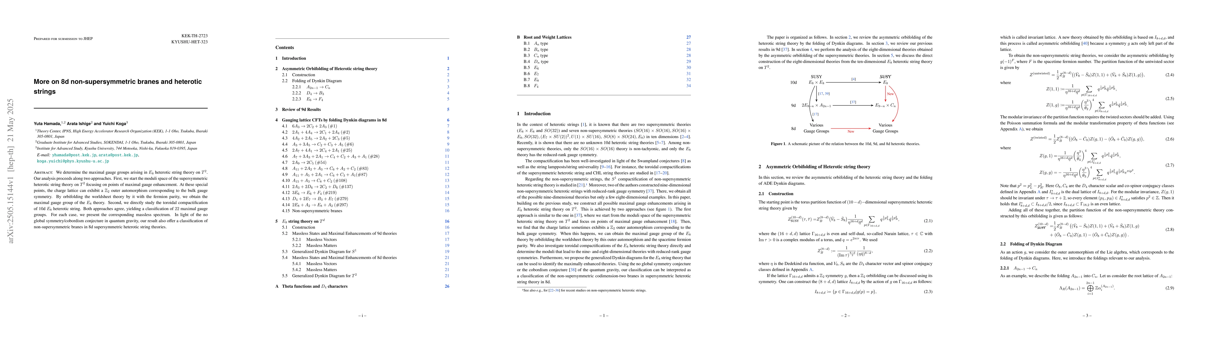 The research determines maximal gauge groups in 8d non-supersymmetric branes and heterotic strings by analyzing two approaches: (1) starting from supersymmetric heterotic string theory on T^2, focusing on points of maximal gauge enhancement and orbifolding the worldsheet theory by a Z_2 outer automorphism, and (2) directly studying the toroidal compactification of 10d E8 heterotic string theory, both leading to a classification of 22 maximal gauge groups with corresponding massless spectra.