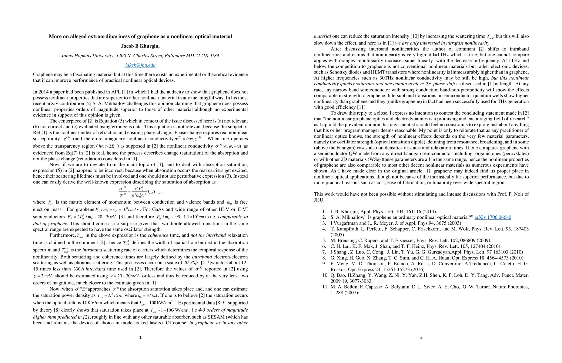 Graphene may be a fascinating material but at this time there exists no experimental or theoretical evidence that it can improve performance of practical nonlinear optical devices.