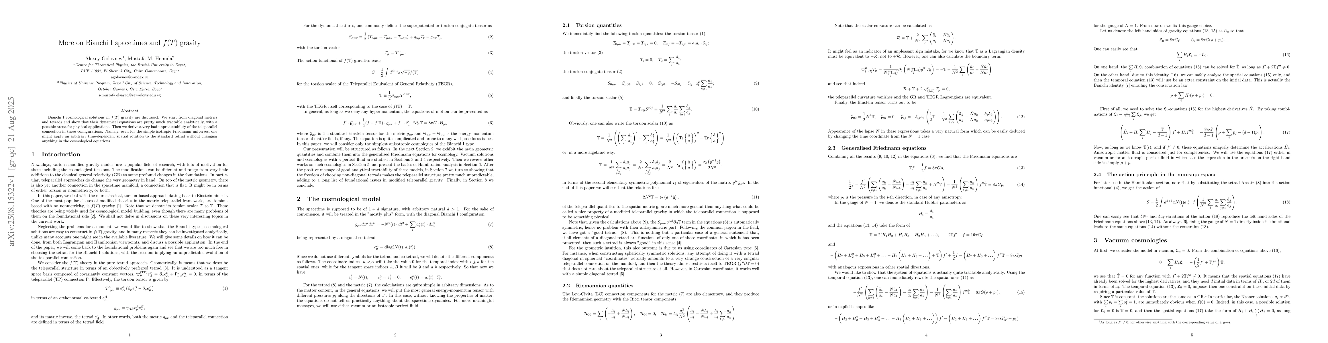 Bianchi I cosmological solutions in f(T) gravity are discussed. We start from diagonal metrics and tetrads and show that their dynamical equations are pretty much tractable analytically, with a possible arena for physical applications. Then we derive a very bad unpredictability of the teleparallel connection in these configurations. Namely, even for the simple isotropic Friedmann universes, one might apply an arbitrary time-dependent spatial rotation to the standard tetrad without changing anything in the cosmological equations.