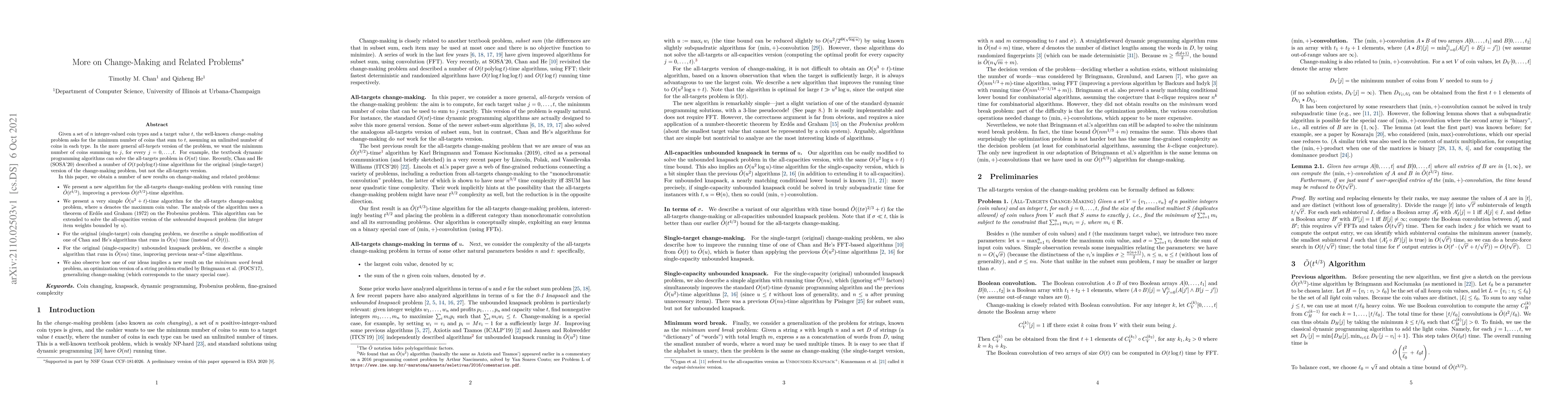 Given a set of $n$ integer-valued coin types and a target value $t$, the well-known change-making problem asks for the minimum number of coins that sum to $t$, assuming an unlimited number of coins in each type. In the more general all-targets version of the problem, we want the minimum number of coins summing to $j$, for every $j=0,\ldots,t$. For example, the textbook dynamic programming algorithms can solve the all-targets problem in $O(nt)$ time. Recently, Chan and He (SOSA'20) described a number of $O(t\,\textrm{polylog}\,t)$-time algorithms for the original (single-target) version of the change-making problem, but not the all-targets version. We obtain a number of new results on change-making and related problems, including: 1. A new algorithm for the all-targets change-making problem with running time $\tilde{O}(t^{4/3})$, improving a previous $\tilde{O}(t^{3/2})$-time algorithm. 2. A very simple $\tilde{O}(u^2+t)$-time algorithm for the all-targets change-making problem, where $u$ denotes the maximum coin value. The analysis of the algorithm uses a theorem of Erd\H{o}s and Graham (1972) on the Frobenius problem. This algorithm can be extended to solve the all-capacities version of the unbounded knapsack problem (for integer item weights bounded by $u$). 3. For the original (single-target) coin changing problem, we describe a simple modification of one of Chan and He's algorithms that runs in $\tilde{O}(u)$ time (instead of $\tilde{O}(t)$). 4. For the original (single-capacity) unbounded knapsack problem, we describe a simple algorithm that runs in $\tilde{O}(nu)$ time, improving previous near-$u^2$-time algorithms. 5. We also observe how one of our ideas implies a new result on the minimum word break problem, an optimization version of a string problem studied by Bringmann et al. (FOCS'17), generalizing change-making (which corresponds to the unary special case).