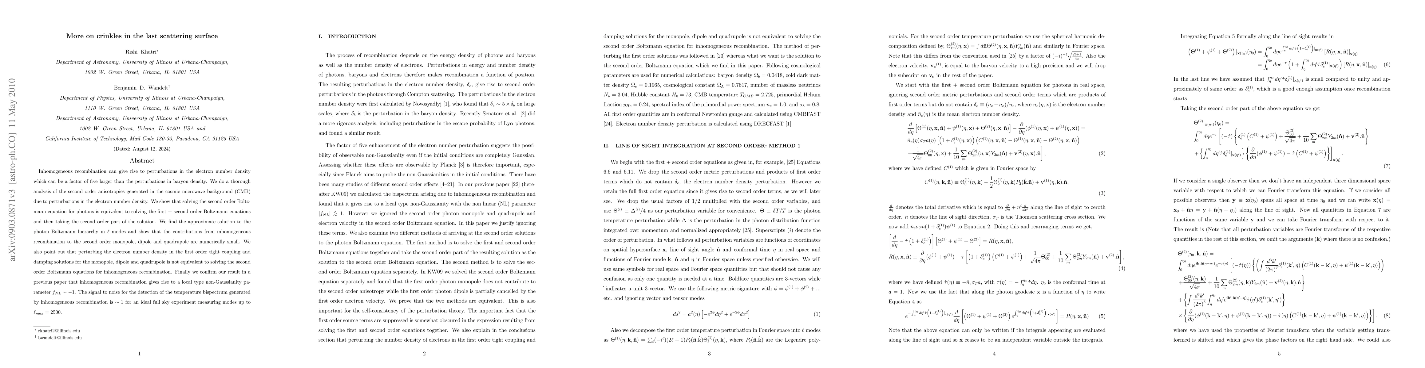 Inhomogeneous recombination can give rise to perturbations in the electron number density which can be a factor of five larger than the perturbations in baryon density. We do a thorough analysis of the second order anisotropies generated in the cosmic microwave background (CMB) due to perturbations in the electron number density. We show that solving the second order Boltzmann equation for photons is equivalent to solving the first + second order Boltzmann equations and then taking the second order part of the solution. We find the approximate solution to the photon Boltzmann hierarchy in l modes and show that the contributions from inhomogeneous recombination to the second order monopole, dipole and quadrupole are numerically small. We also point out that perturbing the electron number density in the first order tight coupling and damping solutions for the monopole, dipole and quadrupole is not equivalent to solving the second order Boltzmann equations for inhomogeneous recombination. Finally we confirm our result in a previous paper that inhomogeneous recombination gives rise to a local type non-Gaussianity parameter f_{NL}~ -1. The signal to noise for the detection of the temperature bispectrum generated by inhomogeneous recombination is ~ 1 for an ideal full sky experiment measuring modes up to l_{max}=2500.
