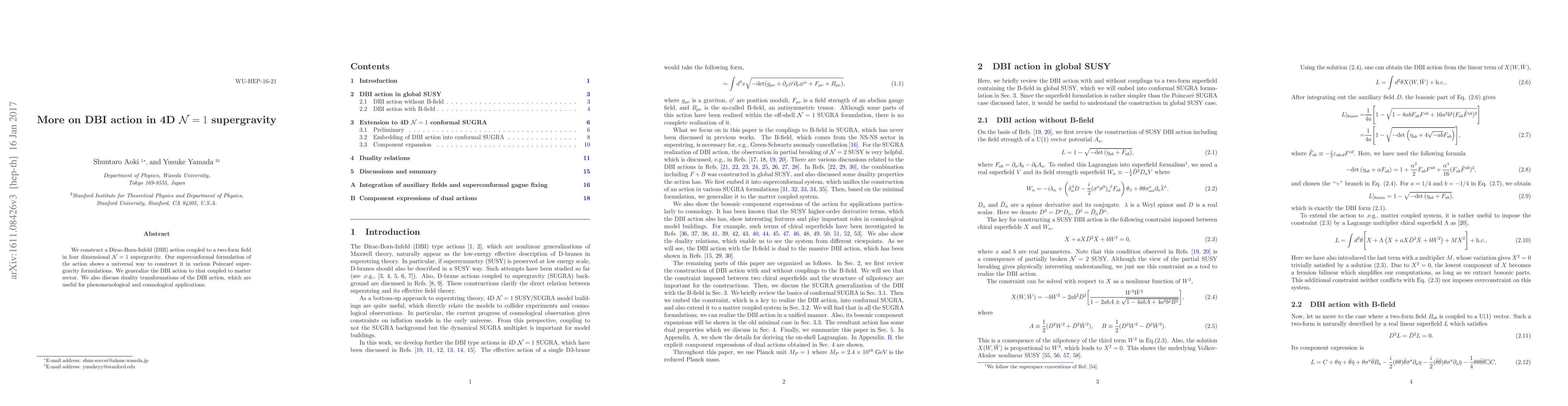This paper constructs a DBI action coupled to a two-form field within 4D $\mathcal{N}=1$ supergravity, demonstrating its formulation in various Poincaré supergravity contexts. It also extends the DBI action to include the matter sector and explores relevant duality transformations for phenomenological and cosmological applications.