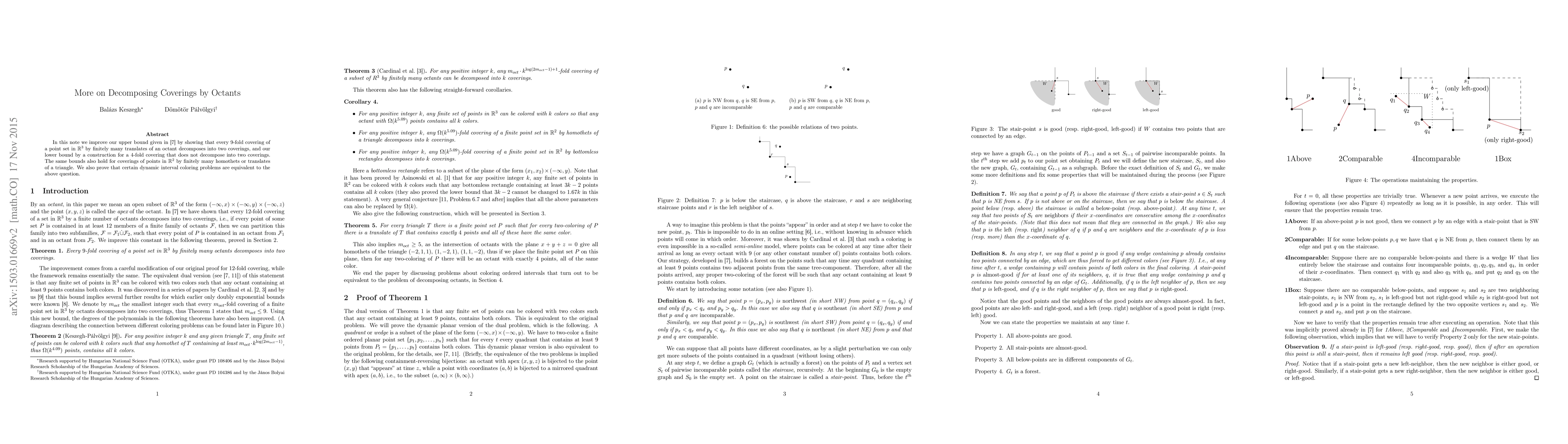 This paper refines earlier bounds on the decomposition of 9-fold coverings of point sets by octants into two coverings, and establishes a lower bound of 4-fold non-decomposable coverings. It also extends these results to coverings in $\R^2$ by triangles and links these geometric problems to dynamic interval coloring issues.