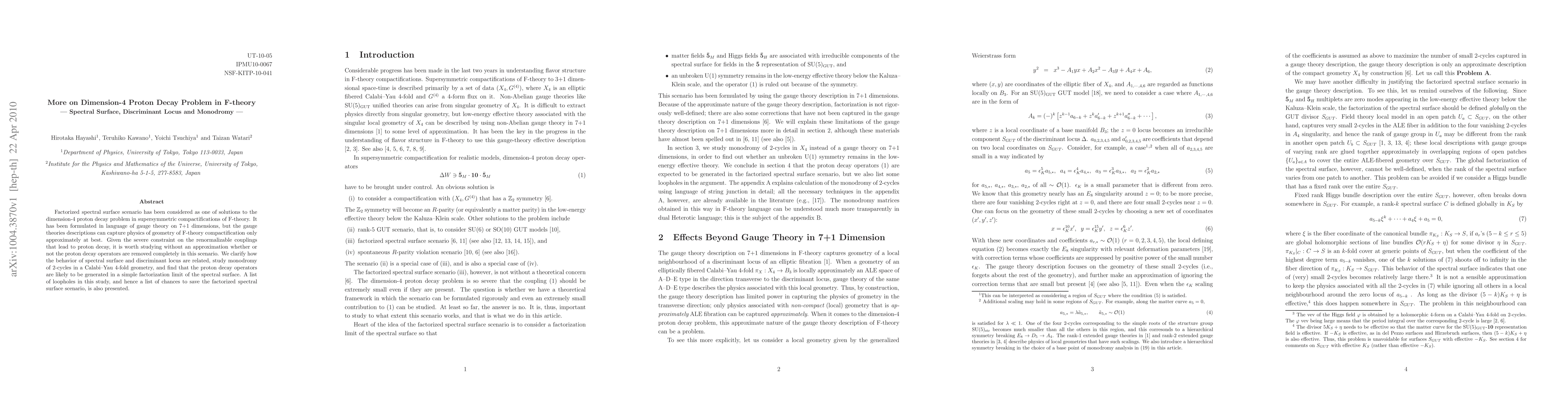 Factorized spectral surface scenario has been considered as one of solutions to the dimension-4 proton decay problem in supersymmetric compactifications of F-theory. It has been formulated in language of gauge theory on 7+1 dimensions, but the gauge theories descriptions can capture physics of geometry of F-theory compactification only approximately at best. Given the severe constraint on the renormalizable couplings that lead to proton decay, it is worth studying without an approximation whether or not the proton decay operators are removed completely in this scenario. We clarify how the behavior of spectral surface and discriminant locus are related, study monodromy of 2-cycles in a Calabi--Yau 4-fold geometry, and find that the proton decay operators are likely to be generated in a simple factorization limit of the spectral surface. A list of loopholes in this study, and hence a list of chances to save the factorized spectral surface scenario, is also presented.