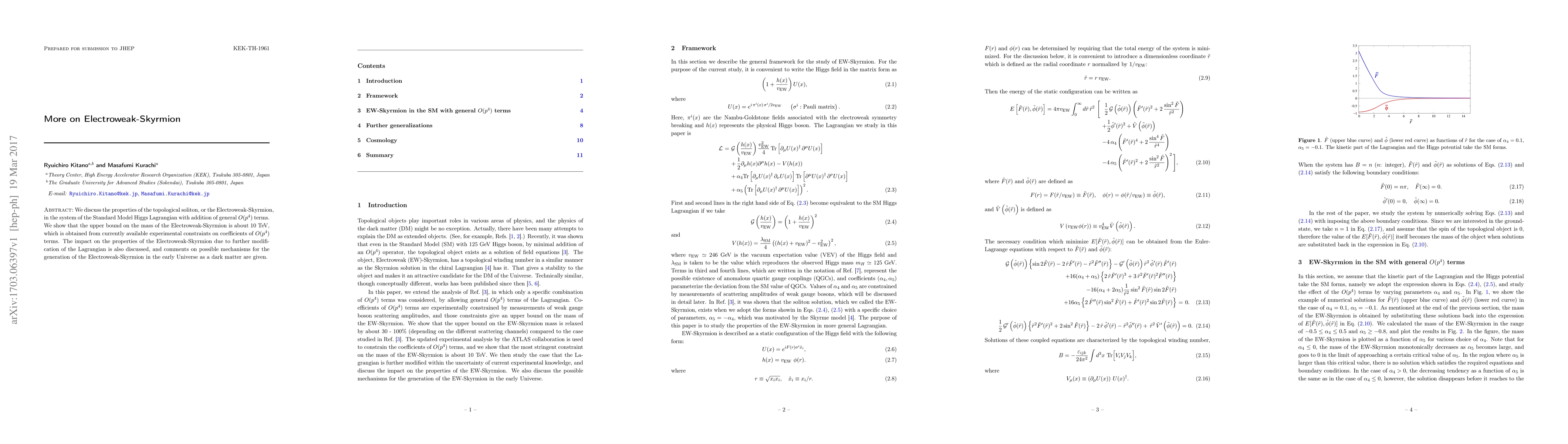 This paper investigates the properties of the Electroweak-Skyrmion, a topological soliton in the Standard Model Higgs Lagrangian with O(p^4) terms, finding an upper mass bound of 10 TeV based on experimental constraints. It also explores modifications to the Lagrangian and potential early Universe mechanisms for its generation as dark matter.