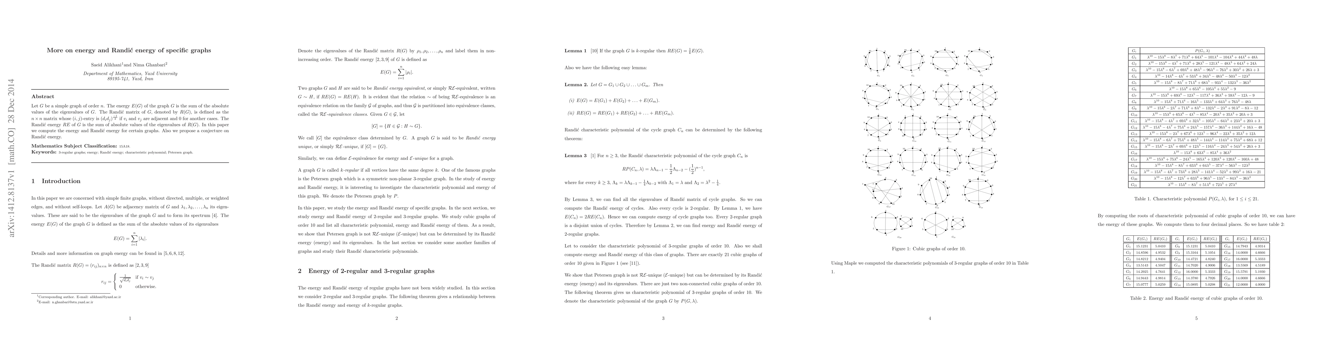Let $G$ be a simple graph of order $n$. The energy $E(G)$ of the graph $G$ is the sum of the absolute values of the eigenvalues of $G$. The Randi\'{c} matrix of $G$, denoted by $R(G)$, is defined as the $n\times n$ matrix whose $(i,j)$-entry is $(d_id_j)^{\frac{-1}{2}}$ if $v_i$ and $v_j$ are adjacent and $0$ for another cases. The Randi\'{c} energy $RE$ of $G$ is the sum of absolute values of the eigenvalues of $R(G)$. In this paper we compute the energy and Randi\'{c} energy for certain graphs. Also we propose a conjecture on Randi\'c energy.